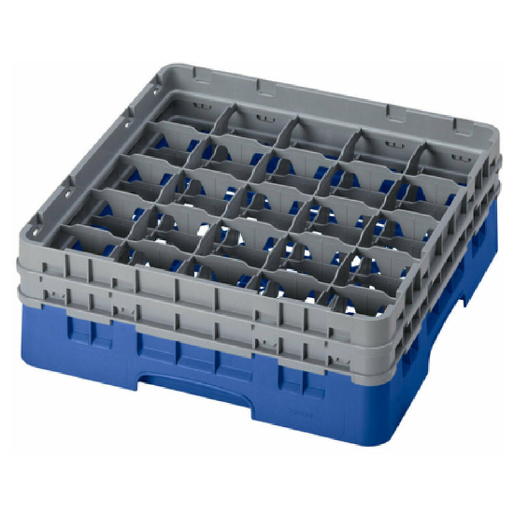 The Cambro 25S434168 Camrack® Glass Rack With (2) Soft Gray Extenders Full Size is an expertly designed storage solution for glassware within various industries, including hospitality and food service. Measuring 19-3/4" x 19-3/4" x 7-1/4", this full-sized glass rack efficiently accommodates up to 25 compartments, each supporting a maximum diameter of 3-7/16" and a maximum height of 5-1/4". This ensures a versatile fit for a range of glass sizes, safeguarding them during storage and transportation. The inclusion of two soft gray extenders enhances its capacity, providing additional protection and height to cater to different glass heights. Constructed in a distinctive blue color, this Camrack® is both HACCP compliant and NSF certified, reflecting its adherence to stringent safety and hygiene standards. The precise engineering of the Cambro 25S434168 makes it an essential tool for maintaining the cleanliness and security of glassware, serving as a reliable asset for sectors requiring rigorous sanitary conditions. Its robust design and functionality are tailored to meet the demands of high-volume operations, ensuring glasses remain pristine and ready for service. This makes the Cambro Camrack® an invaluable resource for establishments striving for operational efficiency and excellence in service delivery.