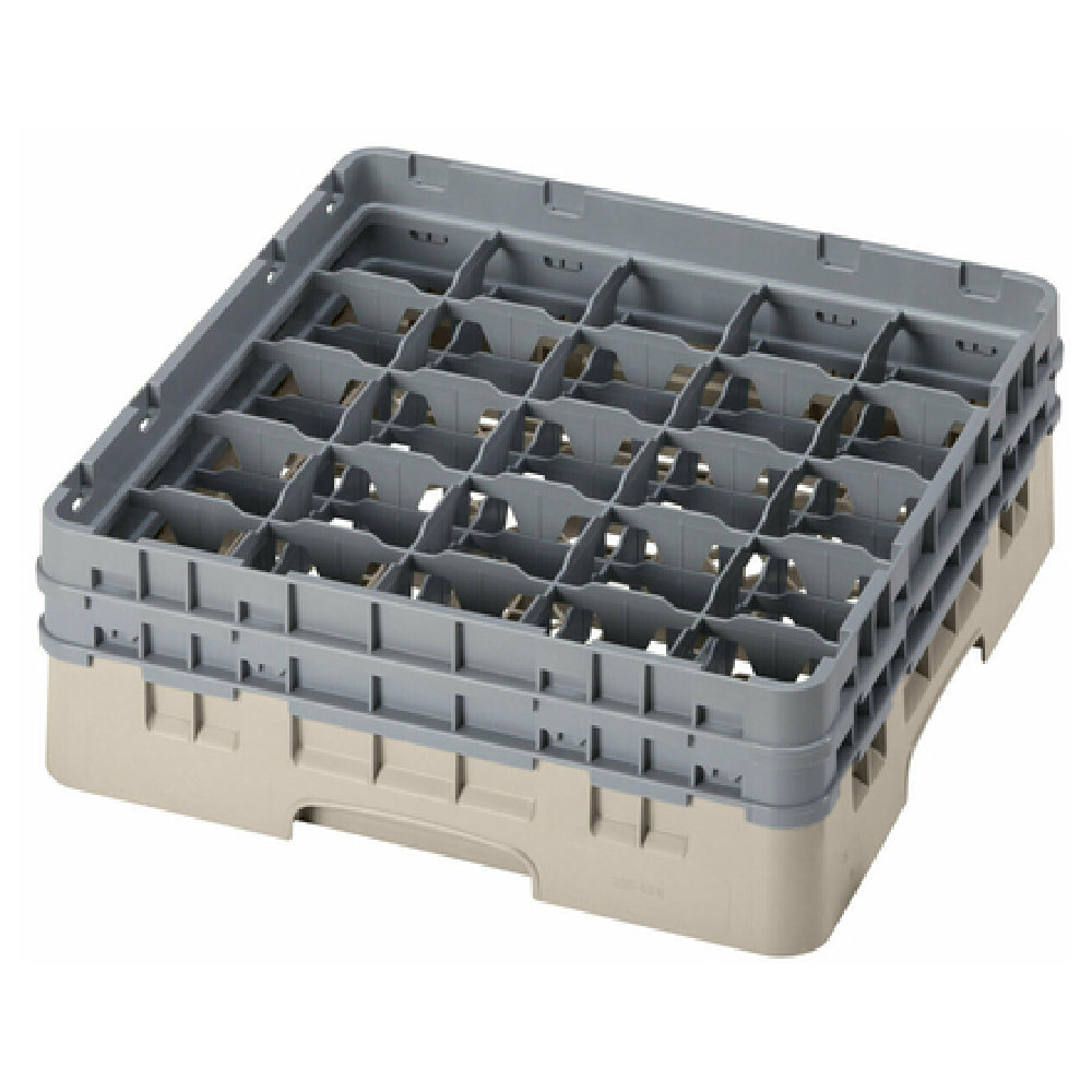 The Cambro 25S434184 Camrack® Glass Rack with (2) soft gray extenders is a full-size glass rack designed to streamline glassware storage and transport in commercial settings. This robust rack measures 19-3/4" x 19-3/4" x 7-1/4" and features 25 individual compartments, each accommodating glassware with a maximum diameter of 3-7/16" and a maximum height of 5-1/4". The addition of two soft gray extenders enhances its capacity, making it versatile for various glass sizes. The beige color complements many kitchen and service environments, while its construction ensures durability and long-term use. This glass rack is HACCP compliant, contributing to food safety protocols, and holds NSF certification, affirming its adherence to strict public health and safety standards. Ideal for restaurants, catering services, and bars, the Cambro Camrack® Glass Rack efficiently organizes glassware, minimizes breakage, and ensures cleanliness, making it an essential tool for maintaining operational efficiency and hygiene in various food service industries.