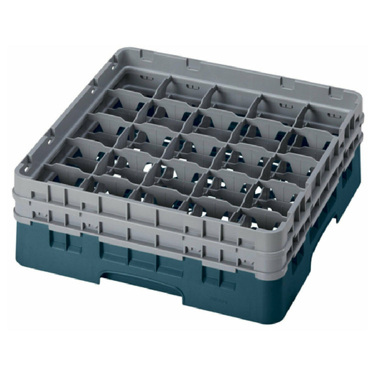 The Cambro 25S434414 Camrack® Glass Rack With (2) Soft Gray Extenders Full Size is a comprehensive solution designed for the efficient storage and transport of glassware in various professional settings. With dimensions of 19-3/4" x 19-3/4" x 7-1/4", this glass rack features (25) compartments that accommodate glassware with a maximum diameter of 3-7/16" and a maximum height of 5-1/4". Each compartment is strategically designed to offer optimal protection and organization, reducing the risk of breakage during handling. The inclusion of (2) soft gray extenders ensures added capacity and versatility, catering to the needs of establishments with varying glassware sizes. The rack's teal color not only provides a visually appealing aesthetic but also adheres to HACCP compliance, making it a suitable choice for businesses prioritizing food safety standards. Additionally, its NSF certification guarantees that it meets the highest standards for public health protection. This full-size glass rack is an invaluable asset across different industry segments, including restaurants, hotels, and catering services, where efficient glassware management is crucial. Its robust construction and thoughtful design highlight its unique value proposition, catering to the diverse needs of professional kitchens and hospitality environments.