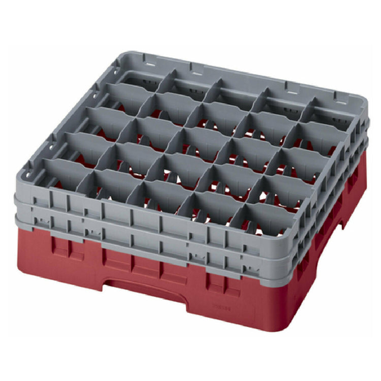 The Cambro 25S434416 Camrack® Glass Rack with (2) soft gray extenders is a full-size solution specifically designed to meet the needs of various segments within the food service and hospitality industries. Measuring 19-3/4 inches by 19-3/4 inches by 7-1/4 inches, this glass rack is engineered to accommodate a total of 25 compartments, each capable of holding glassware with a maximum diameter of 3-7/16 inches and a height of up to 5-1/4 inches. The rack's construction includes two soft gray extenders, enhancing its versatility and capacity to safely store and transport glassware. The cranberry-colored unit is both HACCP compliant and NSF certified, ensuring adherence to food safety and sanitation standards. These features make it an ideal choice for restaurants, catering services, and banquet facilities seeking a durable and efficient glass storage solution. The Cambro Camrack® design emphasizes easy handling and maintenance, providing a practical advantage in high-volume environments where reliability and hygiene are paramount. This product stands out for its careful attention to detail and robust construction, making it a valuable asset for establishments aiming to optimize their glassware management processes.