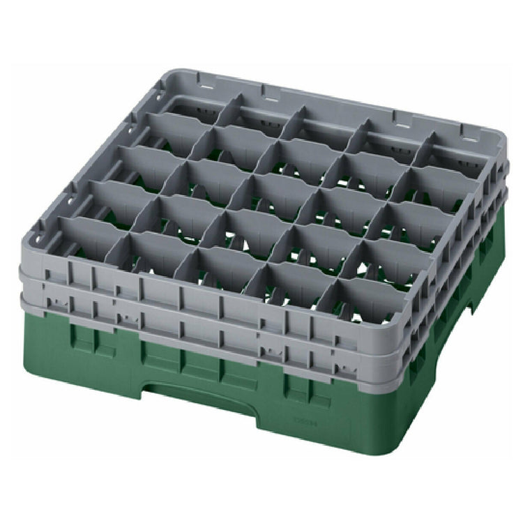 The Cambro 25S534119 Camrack® Glass Rack with (2) soft gray extenders is an expertly designed, full-size rack that caters to the specific needs of various segments within the foodservice and hospitality industries. This low-profile glass rack measures 19-3/4" by 19-3/4" by 7-1/4", providing ample space with its 25 compartments. Each compartment can accommodate glasses with a maximum diameter of 3-7/16" and a height of 6-1/8". The inclusion of two soft gray extenders enhances its capacity and adaptability, making it suitable for a range of glassware. The rack is finished in a distinctive Sherwood green, ensuring easy identification and integration into existing workflows. Engineered for durability and hygiene, the Cambro Camrack® is both HACCP compliant and NSF certified, underscoring its suitability for maintaining high standards in cleanliness and food safety. This glass rack not only maximizes storage efficiency but also serves as a reliable solution for organizing and protecting glassware in busy commercial kitchens, catering services, and hospitality settings. Its unique features and compliance with industry standards highlight its importance in maintaining operational excellence and supporting seamless service delivery in the sectors it serves.