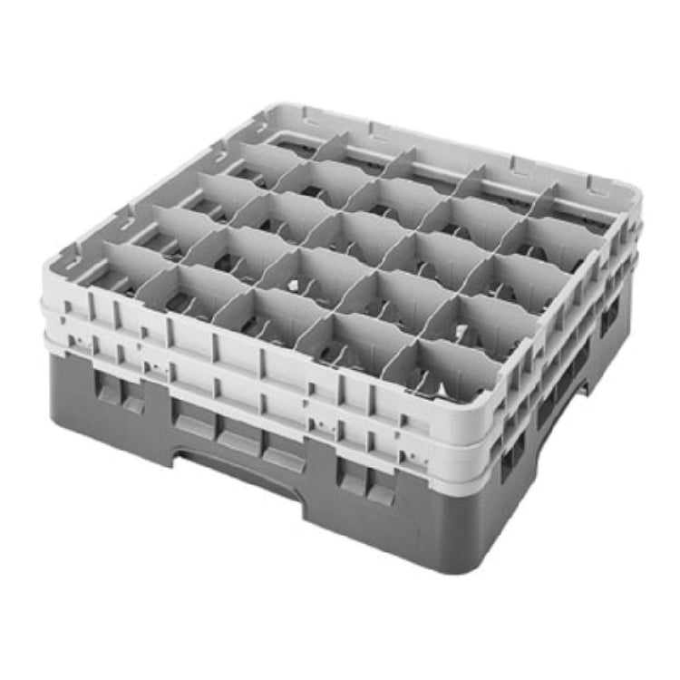 The Cambro 25S534163 Camrack® Glass Rack with (2) Soft Gray Extenders is a full-size, low-profile solution designed for efficient glassware storage and transport within the food service industry. Measuring 19-3/4" x 19-3/4" x 7-1/4", this rack is engineered with 25 compartments, each accommodating a maximum diameter of 3-7/16" and a maximum height of 6-1/8". The inclusion of two soft gray extenders allows for additional capacity, providing flexibility to meet varying storage needs. Constructed in an eye-catching red, it ensures easy identification and organization. Crucially, this glass rack is both HACCP compliant and NSF certified, underscoring its adherence to rigorous health and safety standards. The Cambro Camrack® is an invaluable asset for restaurants, hotels, and catering services, offering a robust and reliable solution for glassware management. Its comprehensive design supports the operational efficiency and sanitation requirements of high-volume service environments, enhancing both functionality and hygiene in professional kitchens and dining areas.