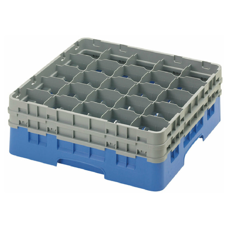 The Cambro 25S534168 Camrack® Glass Rack with (2) soft gray extenders is a full-size, low profile solution perfect for efficiently organizing and washing glassware in commercial settings. Measuring 19-3/4" x 19-3/4" x 7-1/4", it is designed with (25) compartments that accommodate glassware with a maximum diameter of 3-7/16" and a maximum height of 6-1/8". The robust construction and thoughtful design ensure that glasses are held securely, minimizing breakage during washing. The inclusion of two soft gray extenders adds versatility, allowing users to adjust the rack height to meet specific needs. This glass rack is blue in color, and its design complies with HACCP standards, ensuring it meets the necessary safety and health requirements. Additionally, it is NSF certified, assuring users of its quality and suitability for commercial use. This product is ideal for use in restaurants, hotels, and catering services where efficiency and glassware protection are paramount. Its durable build and practical features make it a reliable choice for businesses seeking to optimize their glass cleaning processes, enhancing operational efficiency while maintaining high standards of cleanliness and care for their glassware.