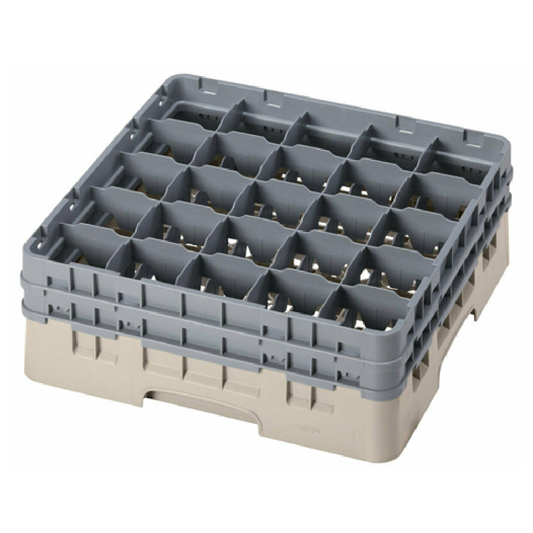 The Cambro 25S534184 Camrack® Glass Rack with (2) soft gray extenders full size is a meticulously designed solution for glassware storage and transport. Measuring 19-3/4 inches by 19-3/4 inches by 7-1/4 inches, this low-profile glass rack is engineered for efficient use in both commercial kitchens and hospitality settings. It features a total of 25 compartments, each accommodating glassware with a maximum diameter of 3-7/16 inches and a maximum height of 6-1/8 inches, ensuring optimal protection and separation of delicate items. The inclusion of two soft gray extenders enhances its capacity, catering to varying height requirements without compromising stability. Constructed in a neutral beige color, the Cambro Camrack® is both HACCP compliant and NSF certified, reflecting its adherence to stringent health and safety standards. These certifications make it particularly valuable for operations prioritizing hygiene and safety in their glassware management. Its design is ideal for restaurants, catering events, and any food service operations seeking a reliable and durable glass storage solution. The Cambro 25S534184 embodies a commitment to quality and functionality, making it a preferred choice for professionals who demand excellence in their operations.