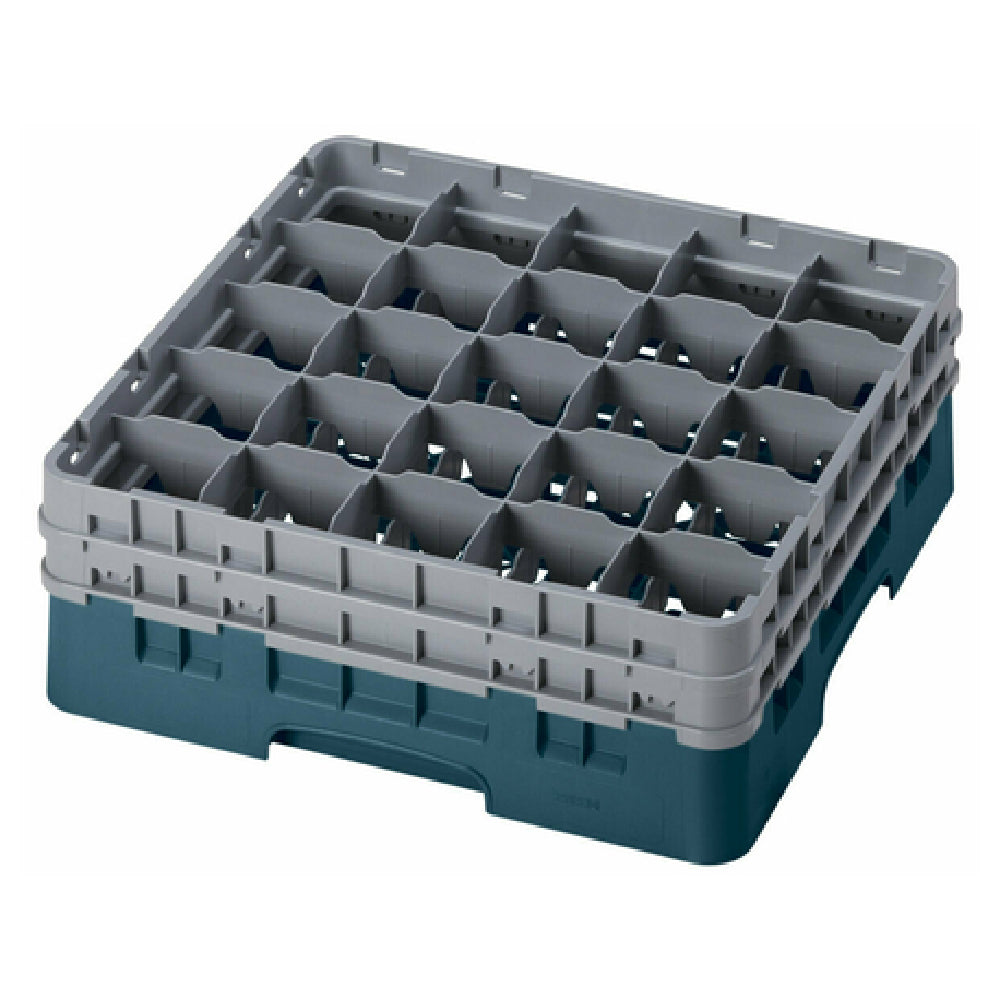 The Cambro 25S534414 Camrack® Glass Rack with (2) soft gray extenders - full size, stands as a top choice for efficient glassware management in professional settings. Measuring 19-3/4" x 19-3/4" x 7-1/4", this low-profile rack is engineered to optimize space and organization, featuring 25 compartments that comfortably accommodate glasses with a maximum diameter of 3-7/16" and a height of up to 6-1/8". Enhanced with two soft gray extenders, the rack offers additional security and support, ensuring delicate glassware is protected during storage and transport. The Camrack® Glass Rack is elegantly finished in a distinctive teal color and adheres to HACCP compliance, underscoring its commitment to stringent safety and hygiene standards. Its NSF certification further reinforces its reliability and suitability for use in environments where public health standards are paramount. This glass rack is an invaluable asset for establishments across the hospitality industry, from bustling restaurants to catered events, providing a functional and reliable solution for glassware management. The Cambro 25S534414 ensures both strength and convenience, making it a critical component in maintaining the efficiency and quality of service in food and beverage operations.