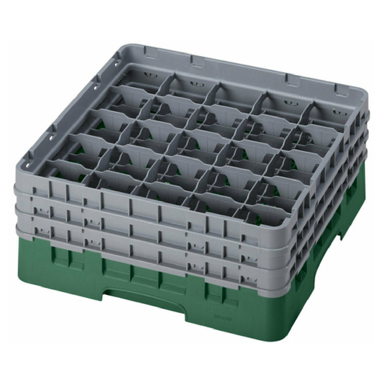 The Cambro 25S638119 Camrack® Glass Rack with (3) soft gray extenders is a versatile and essential tool for efficient glassware management in various food service and hospitality settings. With dimensions measuring 19-3/4" x 19-3/4" x 8-7/8", this full-size rack is designed to accommodate up to 25 compartments, each with a maximum diameter of 3-7/16" and a maximum height of 6-7/8". This precise sizing ensures that glassware is held securely, reducing the risk of damage during transport and storage. The inclusion of three soft gray extenders provides additional height and flexibility, enabling users to customize their glassware storage solutions according to their specific needs. Finished in a Sherwood green hue, this Camrack® is both HACCP compliant and NSF certified, guaranteeing adherence to rigorous health and safety standards. The Cambro 25S638119 is ideal for restaurants, bars, and catering services seeking a reliable and durable glass rack solution that promotes hygiene and efficiency while safeguarding delicate glassware.