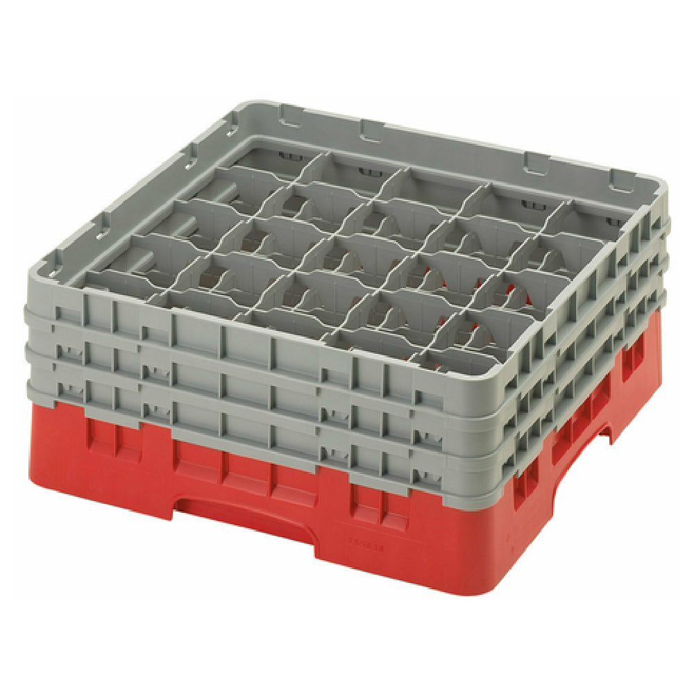 The Cambro 25S638163 Camrack® Glass Rack with (3) soft gray extenders is a meticulously designed, full-size rack measuring 19-3/4" x 19-3/4" x 8-7/8", tailored to meet the demanding needs of the foodservice and hospitality industry. Featuring 25 individual compartments, each accommodating glassware with a maximum diameter of 3-7/16" and a maximum height of 6-7/8", this Camrack® ensures safe and efficient storage of a variety of glassware sizes. The inclusion of three soft gray extenders enhances the rack's capacity and flexibility, catering to diverse operational requirements. Its robust red construction is not only visually distinct but also adheres to HACCP compliance standards, ensuring food safety and hygiene. Furthermore, the NSF certification underscores its commitment to quality and safety, making it an essential asset for establishments where high-volume glassware handling is paramount. The thoughtful engineering behind this glass rack offers reliable performance, making it an indispensable tool for restaurants, banquet facilities, and catering services aiming to streamline operations and maintain impeccable standards in glassware management.