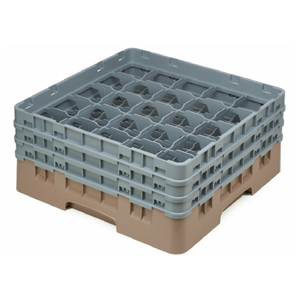 The Cambro 25S638184 Camrack® Glass Rack with (3) Soft Gray Extenders Full Size is meticulously designed to accommodate the rigorous demands of the foodservice industry. With dimensions of 19-3/4" x 19-3/4" x 8-7/8", this glass rack features 25 compartments, each capable of holding glasses with a maximum diameter of 3-7/16" and a maximum height of 6-7/8". The inclusion of three soft gray extenders enhances the rack’s utility, making it adaptable for varied glassware sizes and ensuring optimal protection during transport and storage. Its beige color not only provides a neutral aesthetic but also aligns with HACCP compliance, crucial for maintaining hygiene standards. Additionally, the NSF certification assures adherence to public health and safety regulations, making it a reliable choice for establishments ranging from bustling bars to high-volume catering services. The full-size structure of the Camrack® Glass Rack is engineered to streamline operations, offering scalable solutions to efficiently organize and manage glassware inventory. This product represents a fusion of durability, functionality, and compliance, making it an indispensable tool for entities aiming to uphold quality standards in glassware handling and storage.