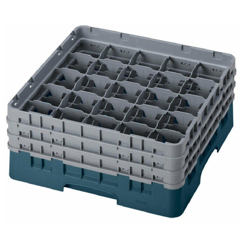 The Cambro 25S638414 Camrack® Glass Rack with (3) soft gray extenders is a full-size glass rack designed to enhance efficiency and safety in professional kitchen environments. Measuring 19-3/4" x 19-3/4" x 8-7/8", it features 25 compartments that can accommodate glassware with a maximum diameter of 3-7/16" and a maximum height of 6-7/8". This design ensures optimal space utilization and secure storage, reducing the risk of breakage during handling and transport. The inclusion of three soft gray extenders allows for adjustable height, offering additional flexibility for varied glass sizes. The rack's teal color not only adds a distinctive touch but also supports easy identification within busy settings. With HACCP compliance, this glass rack aligns with stringent safety and hygiene standards, making it suitable for food service operations that prioritize health protocols. NSF certification further attests to its safety and performance, reinforcing its reliability in diverse market segments, including restaurants, hotels, and catering services. The Cambro 25S638414 is a practical solution for establishments seeking a robust, hygienic, and adaptable glassware storage system.