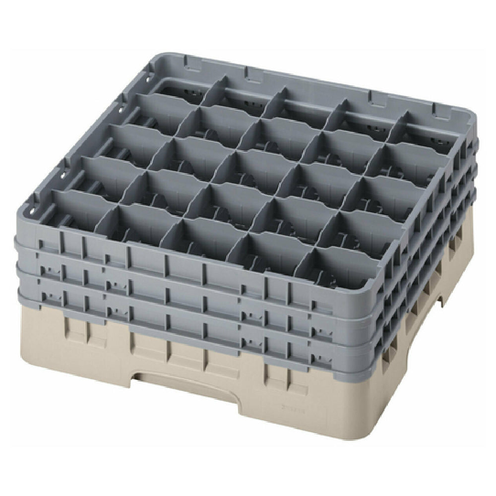 The Cambro 25S738184 Camrack® Glass Rack with (3) soft gray extenders is a full-size, low-profile solution designed to streamline glass handling and storage in commercial settings. Measuring 19-3/4 inches by 19-3/4 inches by 8-7/8 inches, this rack is optimized for space efficiency without compromising on capacity. It features 25 compartments, each accommodating a maximum diameter of 3-7/16 inches and a maximum height of 7-3/4 inches, making it suitable for a diverse range of glassware sizes. The rack's soft gray extenders provide added versatility, allowing for greater flexibility in stacking and storing various glass shapes and sizes. Constructed in a beige color, this rack is both HACCP compliant and NSF certified, ensuring it meets stringent health and safety standards. Its durable design supports rigorous daily use in high-volume environments such as restaurants, hotels, and catering services, where efficient glass management is paramount. The Camrack® Glass Rack's thoughtful construction and compatibility with industry standards make it an invaluable tool for professionals seeking reliable and efficient solutions for glassware organization and hygiene maintenance. This product serves different market segments by enhancing operational efficiency and reducing risks of breakage, making it an essential asset in the foodservice industry.