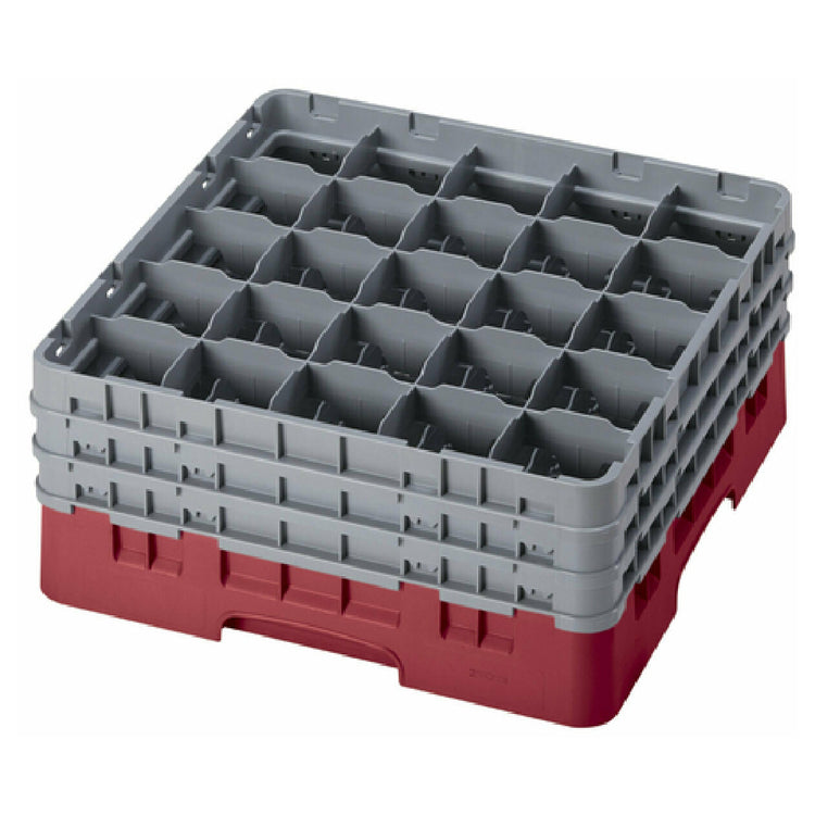 The Cambro 25S738416 Camrack® Glass Rack with (3) soft gray extenders is a robust and versatile solution designed for efficient glassware organization and protection. This full-size rack measures 19-3/4" x 19-3/4" x 8-7/8", accommodating various kitchen and catering needs while maintaining a low profile for streamlined storage. With 25 compartments, each permitting a maximum diameter of 3-7/16" and a maximum height of 7-3/4", it ensures the safe handling and transportation of delicate glassware. The included soft gray extenders allow for customized height adjustments, enhancing its adaptability to different glass sizes. Sporting a distinctive cranberry color, this rack is HACCP compliant and NSF certified, attesting to its adherence to rigorous health and safety standards. Crafted for diverse market segments within the food service industry, the Cambro 25S738416 Camrack® Glass Rack provides an ideal solution for restaurants, hotels, and catering businesses seeking reliable, hygienic, and space-efficient glassware storage and transport options.