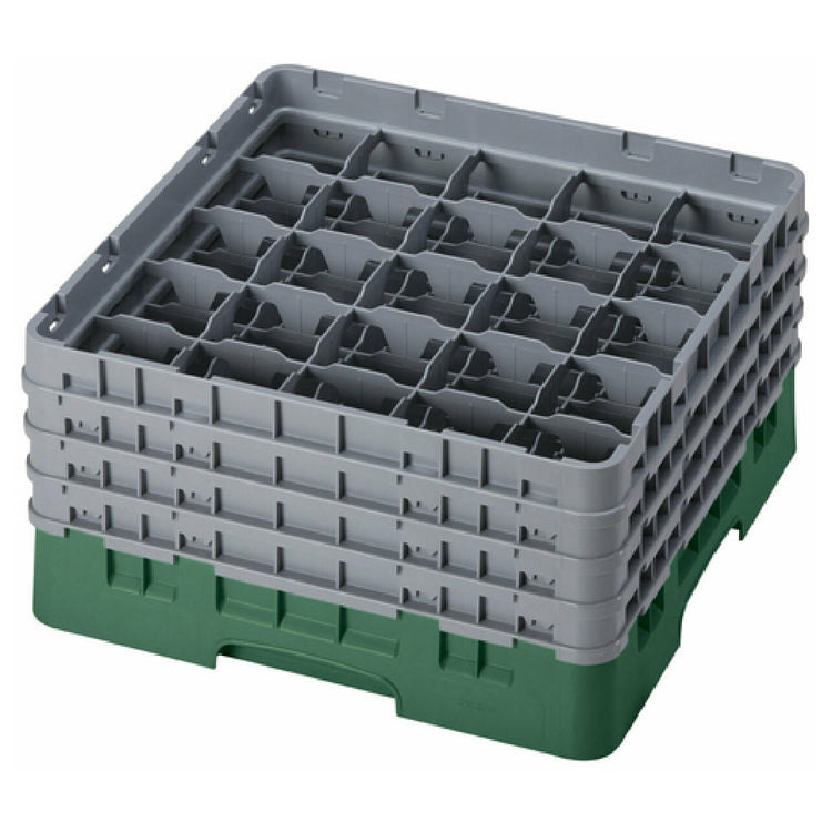 The Cambro 25S800119 Camrack® Glass Rack with (4) soft gray extenders is a full-size, efficient solution for organizing and protecting glassware in commercial settings. With dimensions of 19-3/4" x 19-3/4" x 10-1/2", this glass rack offers ample space with 25 compartments, each accommodating a maximum diameter of 3-7/16" and a maximum height of 8-1/2". The soft gray extenders provide additional height and flexibility, ensuring optimal accommodation for various glass sizes. The rack is finished in a distinctive Sherwood green, making it easily identifiable in busy environments. Importantly, the Cambro Camrack® is both HACCP compliant and NSF certified, emphasizing its adherence to high safety and hygiene standards. This rack is a valuable asset for restaurants, catering services, and hospitality venues, offering a reliable means of transporting, washing, and storing glassware, thus enhancing operational efficiency and glassware longevity.