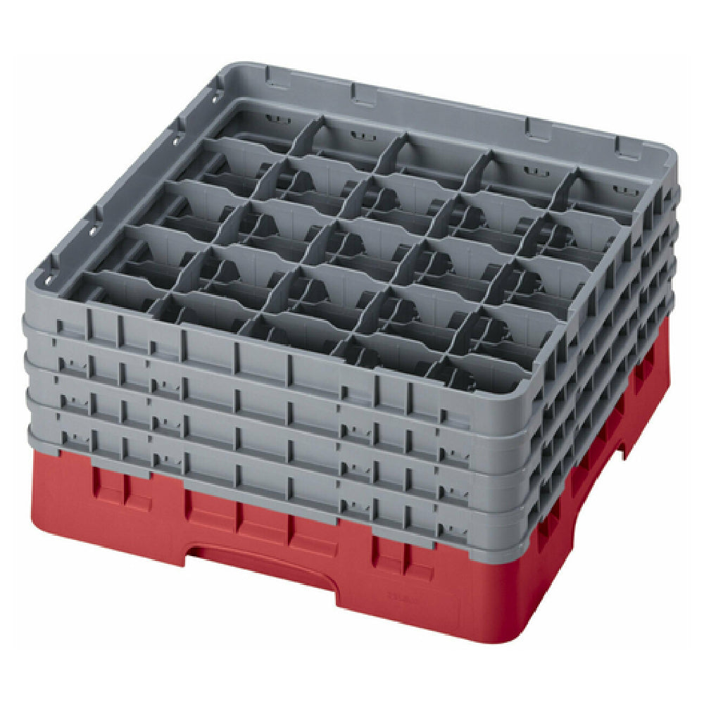 The Cambro 25S800163 Camrack® Glass Rack with (4) soft gray extenders is a full-sized glass rack measuring 19-3/4" x 19-3/4" x 10-1/2", ideally suited for various hospitality industry segments. This versatile rack is equipped with 25 compartments, each accommodating a maximum glass diameter of 3-7/16" and a height of up to 8-1/2", making it perfect for securely storing and transporting a wide range of glassware. Its vibrant red coloration enhances visibility, while the HACCP compliance ensures it meets rigorous hygiene standards. The NSF certification further highlights its adherence to health and safety requirements, offering peace of mind to operators in food service settings. The inclusion of four soft gray extenders allows for customizable height adjustments, enhancing its utility in diverse operational contexts. Designed for durability and efficiency, the Cambro 25S800163 Camrack® is a vital asset for businesses looking to optimize their glassware management processes, from restaurants to catering services. This glass rack's thoughtful design and robust construction make it an essential tool for maintaining cleanliness and organization in high-volume environments.