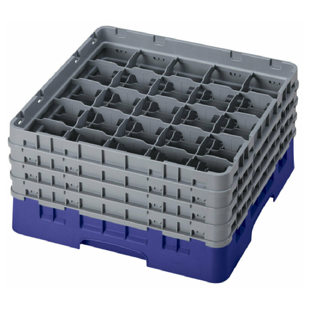 The Cambro 25S800186 Camrack® Glass Rack With (4) Soft Gray Extenders Full Size is an essential tool for efficient glassware management in various food service environments. This full-size rack, measuring 19-3/4 inches by 19-3/4 inches by 10-1/2 inches, offers reliable storage and transport solutions for up to 25 glass compartments. Each compartment can accommodate glassware with a maximum diameter of 3-7/16 inches and a height of up to 8-1/2 inches, catering to diverse glass sizes commonly used in restaurants, hotels, and catering services. The rack features a sophisticated navy blue finish, complemented by four soft gray extenders that enhance its capacity and versatility. Designed with durability and hygiene in mind, the Cambro 25S800186 is HACCP compliant and certified by NSF, ensuring it meets rigorous safety and quality standards applicable in the food service industry. This product is particularly suited for operations requiring both extensive storage and adherence to hygiene protocols, providing a robust and dependable solution for glassware organization and maintenance.