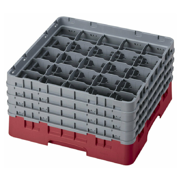 The Cambro 25S800416 Camrack® Glass Rack with (4) Soft Gray Extenders is a full-size rack designed to meet the rigorous demands of commercial kitchens and catering services. Measuring 19-3/4" x 19-3/4" x 10-1/2", this versatile rack features (25) compartments, each capable of accommodating glasses with a maximum diameter of 3-7/16" and a height of up to 8-1/2", making it suitable for various glass sizes. The rack is built with soft gray extenders, enhancing its capacity and ensuring a secure fit for taller glasses. Its cranberry color adds a touch of distinction while ensuring easy identification and organization within a busy environment. The Camrack® is both HACCP compliant and NSF certified, underscoring its commitment to meeting stringent hygiene and safety standards, crucial for businesses focused on food safety and quality compliance. This rack is ideal for different market segments, including restaurants, bars, and hotels, where efficient glass storage and transport are paramount. Its robust construction and thoughtful design make the Cambro 25S800416 an indispensable tool for ensuring glasses are kept safe and clean, reducing breakage risk and maintaining operational efficiency in high-paced settings.