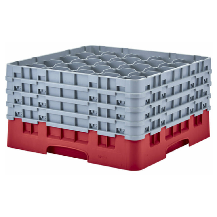 The Cambro 25S900163 Camrack® Glass Rack with (4) Soft Gray Extenders Full Size is a meticulously designed storage solution tailored for various segments within the food service industry. This full-size glass rack measures 19-3/4 inches by 19-3/4 inches by 10-1/2 inches, providing ample space and organizational efficiency with its 25 compartments. Each compartment accommodates glassware with a maximum diameter of 3-7/16 inches and a maximum height of 9-3/8 inches, ensuring secure and stable storage. The inclusion of four soft gray extenders enhances the rack's versatility and adaptability to different glassware sizes and shapes. The vibrant red color adds a distinctive touch, making it easily identifiable in busy kitchen environments. The Cambro Camrack is both HACCP compliant and NSF certified, reflecting its alignment with stringent health, safety, and hygiene standards. This glass rack is engineered to support operational efficiency and maintain high standards of cleanliness, making it an invaluable asset for restaurants, catering services, and hospitality establishments seeking reliable and professional-grade glassware storage solutions.