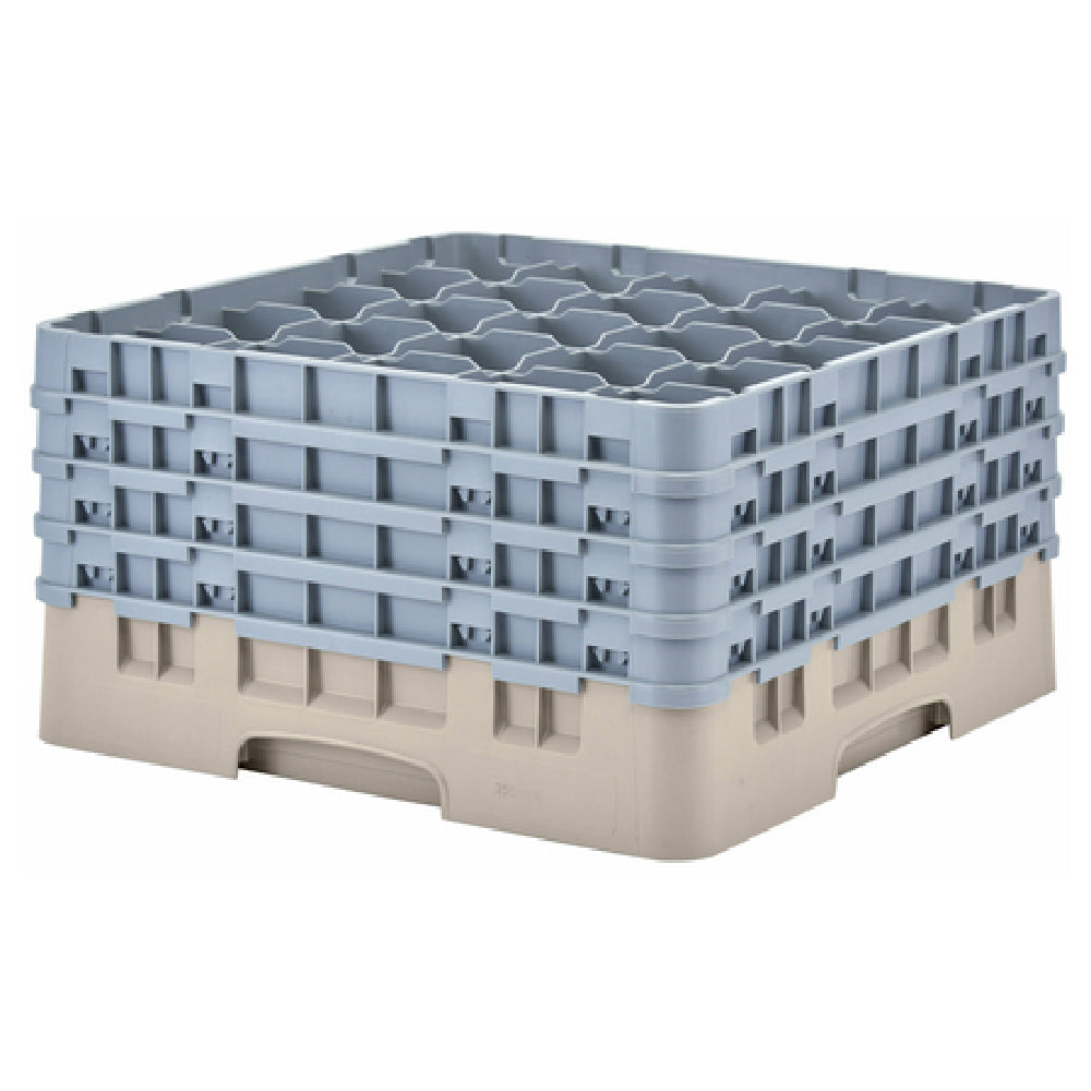 The Cambro 25S900184 Camrack® Glass Rack with (4) Soft Gray Extenders Full Size is a specialized storage solution designed for efficient and organized glass handling in various settings. Measuring 19-3/4" x 19-3/4" x 10-1/2", this rack features a low-profile structure, making it suitable for compact storage spaces. It includes 25 compartments, each accommodating a maximum glass diameter of 3-7/16" and a height of 9-3/8", ensuring ample space for a wide range of glass sizes. The inclusion of four soft gray extenders enhances its versatility by allowing for customizable storage configurations, thus catering to different operational needs in the hospitality and foodservice industries. The Camrack is manufactured in beige, aligning with a neutral aesthetic suitable for various environments. It meets HACCP compliance standards, which highlights its suitability for maintaining high food safety and hygiene standards. Additionally, being NSF certified, this product assures adherence to public health and safety guidelines, making it a reliable choice for businesses prioritizing quality and compliance. The Cambro 25S900184 Camrack® Glass Rack serves as an essential accessory for establishments looking to streamline their glassware storage and transport processes with efficiency and reliability.