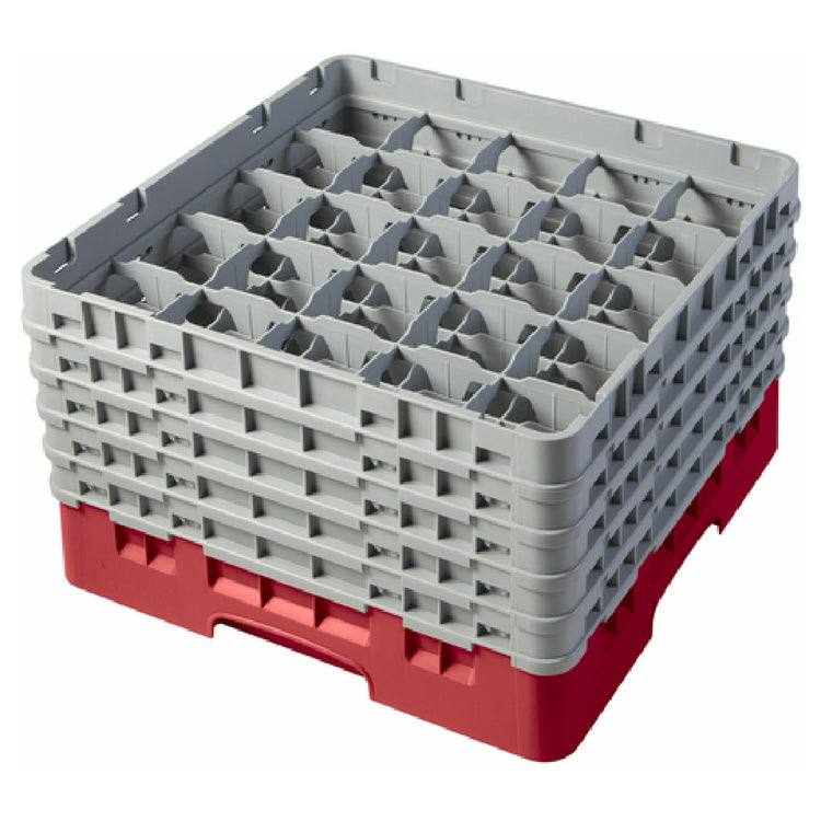 The Cambro 25S958163 Camrack® Glass Rack with (5) soft gray extenders is a full-size solution for efficiently organizing and transporting glassware in commercial settings. Measuring 19-3/4" x 19-3/4" x 12-1/8", this glass rack features 25 compartments designed to securely hold glassware up to a maximum diameter of 3-7/16" and a maximum height of 10-1/8". It is crafted in a vibrant red color, offering not only functionality but also an aesthetic appeal. The inclusion of five soft gray extenders allows for adjustable stacking, providing flexibility to accommodate varying glass heights, making it ideal for restaurants, hotels, and catering services that require versatile storage solutions. The Camrack® is both HACCP compliant and NSF certified, highlighting its adherence to high standards of hygiene and safety. This makes it suitable for environments where cleanliness is critical, such as food service or healthcare facilities. The robust design ensures durability in demanding environments, contributing to a longer lifespan and reduced replacement costs. Cambro's innovative design and reliable construction make this glass rack a valuable asset in maintaining organized and efficient glassware storage across different industries.