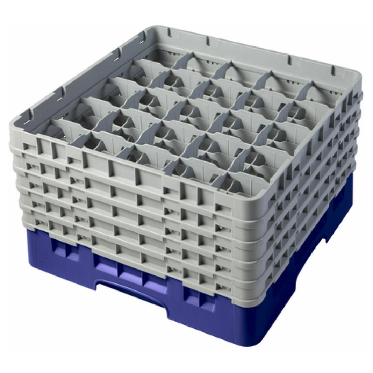 The Cambro 25S958186 Camrack® Glass Rack with (5) Soft Gray Extenders Full Size is a versatile storage solution meticulously designed for foodservice operations requiring organized and efficient glassware management. The rack measures 19-3/4" x 19-3/4" x 12-1/8", providing ample space to accommodate its 25 compartments, each engineered to hold glasses with a maximum diameter of 3-7/16" and a maximum height of 10-1/8". The inclusion of five soft gray extenders enhances its capacity, making it adaptable for various glass sizes and shapes. Crafted in a navy blue hue, this glass rack not only adds a touch of elegance to kitchen environments but also signifies its heavy-duty construction. Moreover, it adheres to HACCP guidelines and is NSF compliant, ensuring that it meets the highest standards for public health and safety. This makes it an indispensable tool for restaurants, hotels, and catering services looking for reliable and hygienic glassware storage. Its thoughtful design facilitates easy handling and maximum protection for glasses during washing, transport, and storage, underscoring its utility and efficiency in a fast-paced foodservice setting.