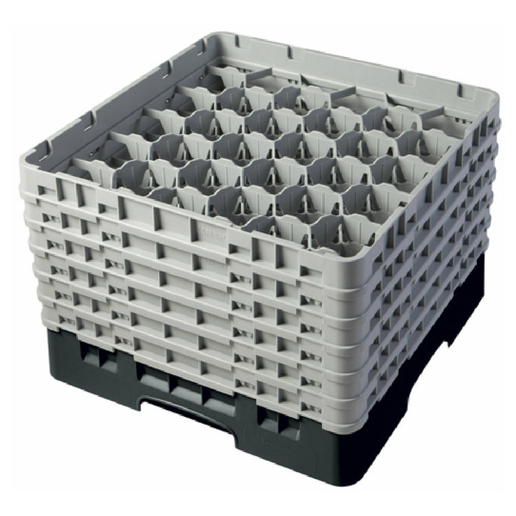 The Cambro 30S1114110 Camrack® Glass Rack with (6) soft gray extenders is a full-size rack designed to meet the demands of the foodservice and hospitality industries. Measuring 19-3/4" x 19-3/4" x 13-3/4", it provides ample space with its (30) compartments, each accommodating a maximum diameter of 3-1/8" and a maximum height of 11-3/4". This configuration allows for optimal storage and secure transportation of glassware, making it an essential tool for any business requiring efficient and reliable glass management. The rack's black color provides a sleek, professional appearance, while the soft gray extenders contribute to its adaptability, accommodating various glass sizes while maintaining stability during transport. The Cambro Camrack® is HACCP compliant, ensuring it meets the rigorous standards for food safety and sanitation. Additionally, it holds an NSF certification, further validating its quality and safety for use in any professional setting. This glass rack is particularly advantageous for restaurants, hotels, and catering services, where its robust design supports high-volume use and repeated washing cycles, safeguarding glassware and optimizing workflow efficiency.