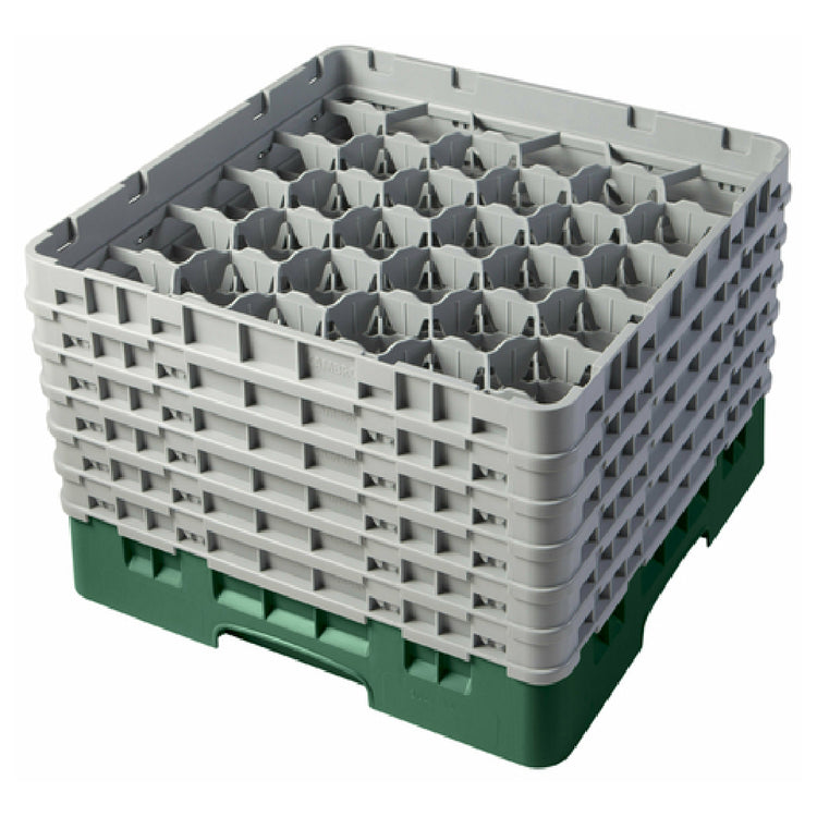 The Cambro 30S1114119 Camrack® Glass Rack With (6) Soft Gray Extenders Full Size is a comprehensive storage solution designed for efficient organization and protection of glassware. With dimensions of 19-3/4" x 19-3/4" x 13-3/4", this full-size rack is structured to accommodate a total of 30 compartments, each capable of holding items with a maximum diameter of 3-1/8" and a maximum height of 11-3/4". The additional (6) soft gray extenders provide enhanced adaptability to varying glass heights and ensure safe stacking. The rack's Sherwood green hue not only offers a visually striking appearance but also signifies its HACCP compliance, aligning with stringent hygiene and safety standards. This compliance is further emphasized by its NSF certification, affirming its suitability for use in professional food service environments. This glass rack is ideal for a wide range of industry segments, including but not limited to restaurants, catering services, and hospitality venues, providing a reliable and durable solution for glassware management. The Cambro 30S1114119 Camrack® is engineered to deliver unparalleled convenience and efficiency in maintaining cleanliness and organization, making it a valuable asset for any establishment aiming to maintain high operational standards.