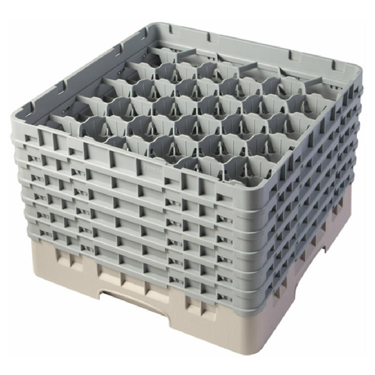 The Cambro 30S1114184 Camrack® Glass Rack With (6) Soft Gray Extenders Full Size is meticulously engineered to provide exceptional storage and protection for fragile glassware in hospitality and foodservice industries. Boasting dimensions of 19-3/4" x 19-3/4" x 13-3/4", this glass rack is equipped with 30 compartments, each designed to securely accommodate glasses with a maximum diameter of 3-1/8" and a maximum height of 11-3/4". Its full-size configuration ensures a substantial capacity, ideal for high-volume operations. The six soft gray extenders enhance its versatility, allowing for easy stacking and adaptation to different glass heights. Crafted in a beige finish, this glass rack is both HACCP compliant and NSF certified, emphasizing its adherence to stringent hygiene and safety standards. The Cambro Camrack® is a valuable asset for businesses seeking reliable glassware management solutions, offering durability and ease of use across diverse environments. Its robust design and thoughtful features make it an essential tool for maximizing efficiency and maintaining glassware integrity in bustling commercial settings.