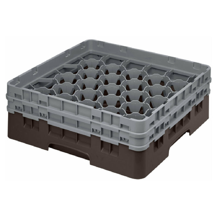 The Cambro 30S434167 Camrack® Glass Rack with (2) soft gray extenders is a full-size, high-performance storage solution designed for efficient glassware management in various industry settings. Measuring 19-3/4" x 19-3/4" x 7-1/4", this rack features 30 compartments, each capable of accommodating a maximum diameter of 3-1/8" and a height of 5-1/4". The addition of two soft gray extenders enhances its storage capacity, ensuring secure and organized placement of glassware. The rack's construction in a distinctive brown color is not only aesthetically pleasing but also HACCP compliant, ensuring adherence to stringent food safety standards. Furthermore, the NSF certification underscores its compliance with public health and safety regulations. This glass rack is particularly beneficial for industries such as hospitality, catering, and food service, where maintaining hygiene and optimizing storage are critical. Its robust design facilitates secure transport and storage of delicate glassware, minimizing the risk of breakage. The Cambro 30S434167 represents a perfect fusion of durability and functionality, catering to the operational needs of businesses that prioritize efficiency and reliability in their glassware handling processes.