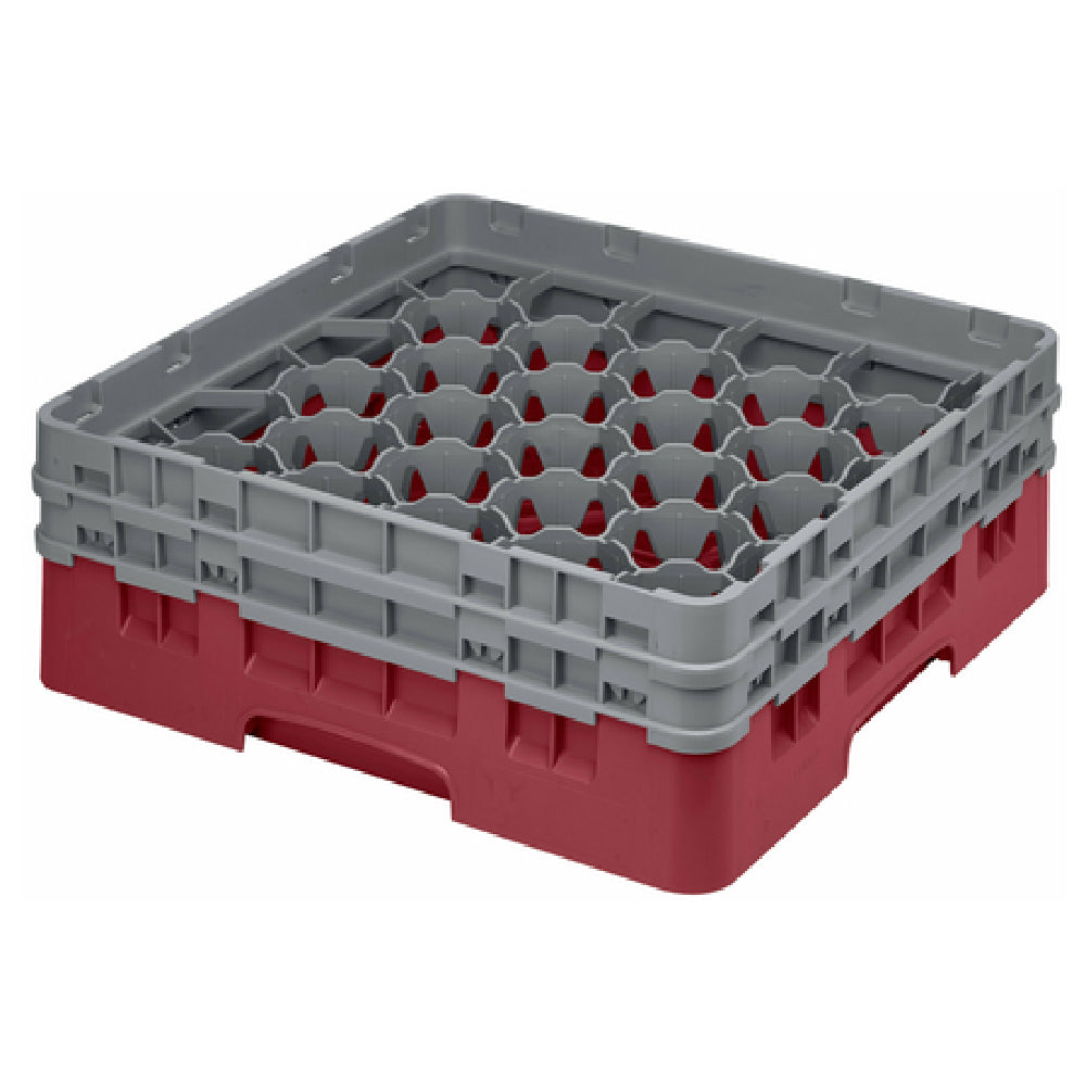 The Cambro 30S434416 Camrack® Glass Rack with (2) soft gray extenders full size is a meticulously designed solution for the efficient storage and transportation of glassware in various hospitality and food service settings. This full-size glass rack measures 19-3/4" x 19-3/4" x 7-1/4", and it is equipped with 30 individual compartments that can accommodate glasses with a maximum diameter of 3-1/8" and a maximum height of 5-1/4". The additional soft gray extenders provide extra flexibility and protection, making it suitable for different glassware sizes and shapes. The rack features a distinctive cranberry color and is both HACCP compliant and NSF certified, ensuring it meets rigorous health and safety standards. This product is ideal for restaurants, hotels, and catering services that require reliable and hygienic glassware handling solutions. Its robust design not only enhances glass protection during washing, storage, and transport but also streamlines operations in high-demand environments, reducing the risk of breakage and improving organizational efficiency.