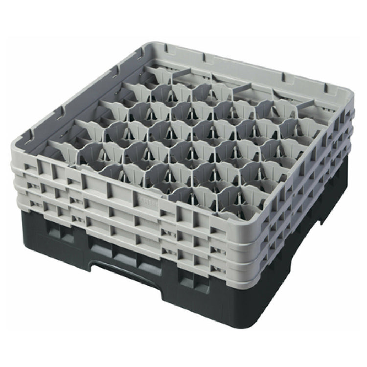 The Cambro 30S638110 Camrack® Glass Rack with (3) Soft Gray Extenders Full Size is a meticulously designed storage and washing solution ideal for a variety of industries, including food service and hospitality. This full-size rack measures 19-3/4" x 19-3/4" x 8-7/8", providing ample space for efficient glassware handling. With 30 compartments, each accommodating a maximum diameter of 3-1/8" and a maximum height of 6-7/8", the rack ensures each piece is securely held while optimizing space. The inclusion of three soft gray extenders allows for additional flexibility and height customization, making it suitable for different glass sizes and shapes. The rack's black color not only adds an elegant touch but also enhances organization by providing clear visibility of stored contents. HACCP compliance ensures this product supports optimal food safety practices, while NSF certification confirms it meets rigorous public health standards. This glass rack is a crucial asset in maintaining high levels of cleanliness and efficiency, catering to the specific needs of businesses focused on hygiene and streamlined operations. Cambro's Camrack® Glass Rack is engineered to withstand the demands of busy environments, offering a durable and reliable solution for glassware management.