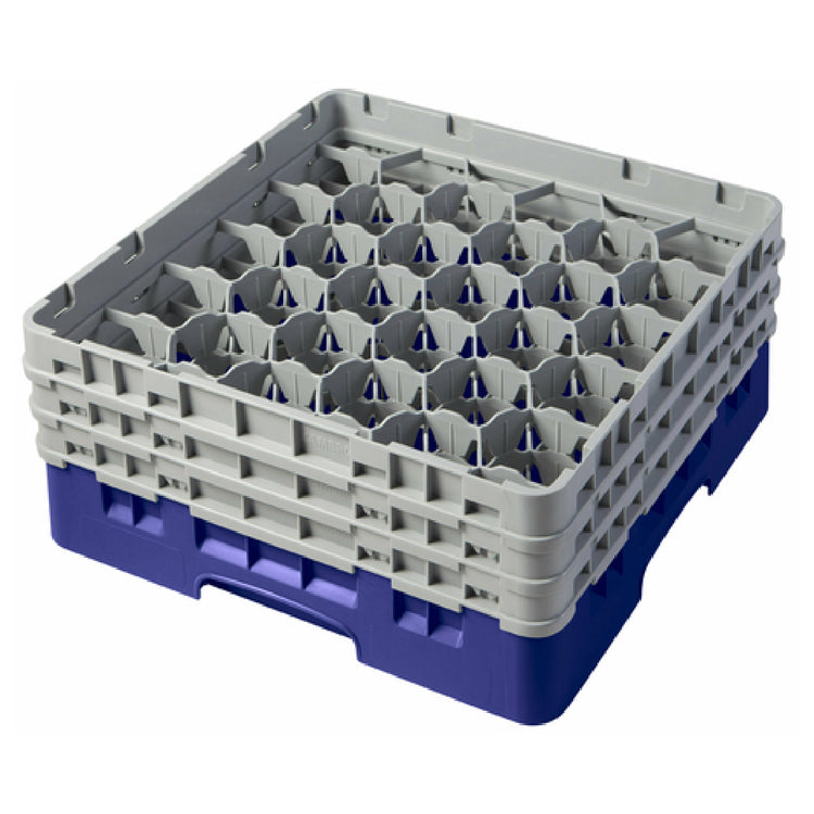 The Cambro 30S638186 Camrack® Glass Rack with (3) Soft Gray Extenders Full Size is an essential solution for efficient glassware management, particularly in food service and hospitality industries. Measuring 19-3/4" x 19-3/4" x 8-7/8", this glass rack is designed to accommodate up to 30 compartments, each with a maximum diameter of 3-1/8" and a maximum height of 6-7/8". Its navy blue hue not only adds a touch of sophistication but also complements the functionality of the rack. The addition of three soft gray extenders enhances the rack's versatility, allowing it to adjust to various glass sizes and shapes. This product is both HACCP compliant and NSF certified, ensuring it meets rigorous health and safety standards, making it a reliable choice for maintaining hygiene and efficiency in glassware management. The Cambro 30S638186 is ideal for establishments that require organized storage and transportation of glassware, such as restaurants, bars, or catering services, providing a practical and high-quality solution for glassware protection during washing and handling processes.