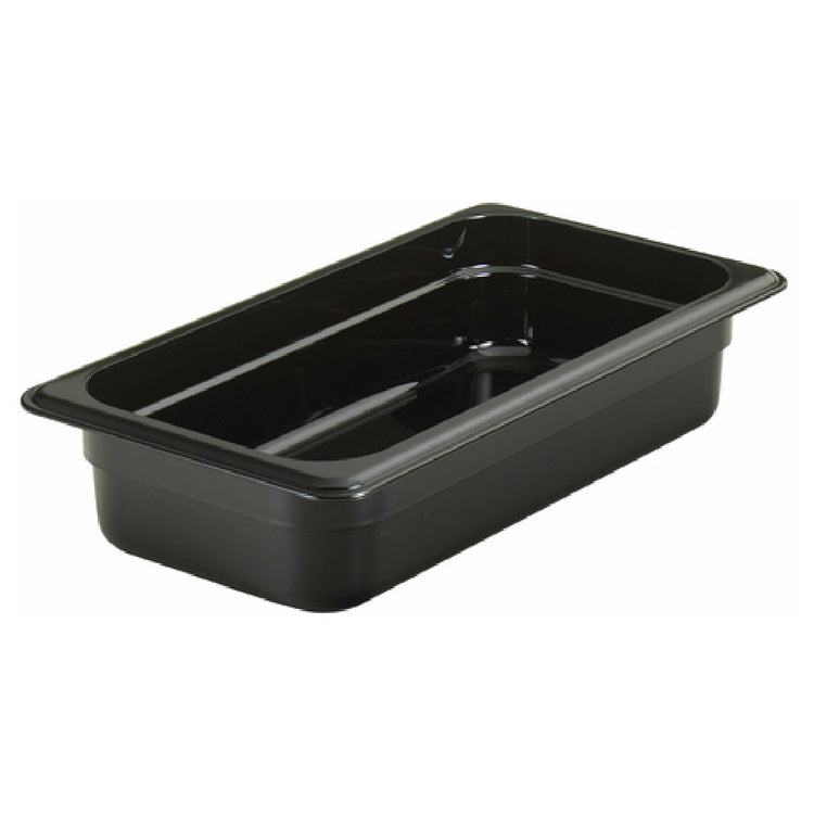 The Cambro 32CW110 Camwear® Food Pan is a versatile and essential tool for food service professionals, offering a 2.5-quart capacity in a compact 1/3 size format. Its dimensions include a 2-1/2 inch depth, making it suitable for a variety of culinary applications where space is at a premium but volume is still required. Crafted from durable polycarbonate, this food pan is designed to withstand the rigors of a busy kitchen, resisting chips, cracks, and dents while maintaining its sleek and professional appearance. Its black hue not only adds a touch of elegance but also enhances visibility of ingredients, ensuring efficient and accurate portioning. This Camwear® food pan is NSF certified, assuring users of its compliance with international standards for safety and sanitation. Ideal for use in any food service setting, from high-end restaurants to bustling cafeterias, the Cambro 32CW110 provides a reliable and practical solution for food storage, preparation, and presentation. Its construction is specifically tailored to meet the demands of both front-of-house and back-of-house operations, offering resilience and performance that cater to the diverse needs of the food industry. Whether used for cold or hot applications, this pan stands out as a valuable asset in any professional kitchen environment.