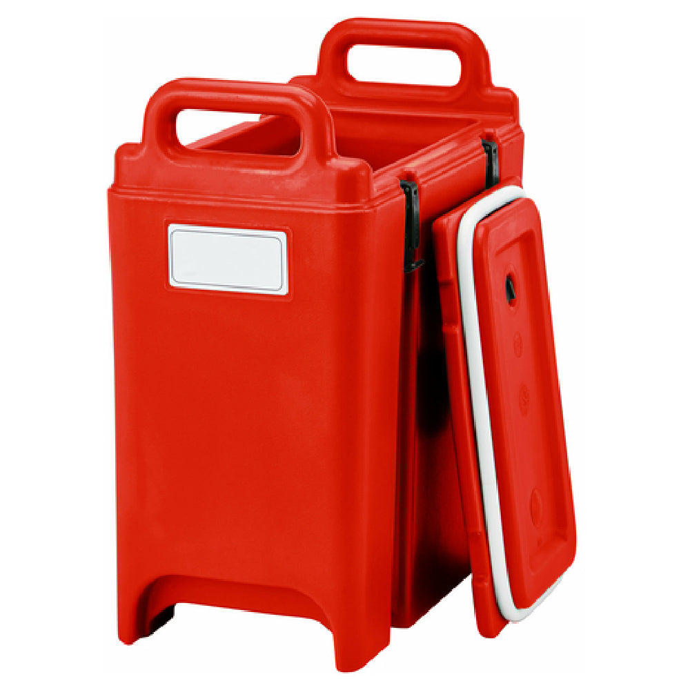 The Cambro 350LCD158 Camtainer® Soup Carrier is a versatile and reliable solution designed to meet the needs of various markets within the food service industry. With a capacity of 3-3/8 gallons, this compact carrier measures 9 inches in width, 16-1/2 inches in depth, and 18-3/8 inches in height, making it an efficient choice for transporting soups and other hot liquids. Constructed from insulated plastic, the hot red Cambro 350LCD158 ensures excellent temperature retention, allowing contents to remain hot for extended periods. Although it does not feature a spigot, its design facilitates easy pouring and serving. The absence of a spigot can be advantageous in scenarios where precise portion control is not required, simplifying the structure and reducing potential maintenance issues. This product is NSF certified, highlighting its compliance with rigorous public health and safety standards. The Cambro 350LCD158 is an ideal solution for catering companies, restaurants, and institutional kitchens seeking a robust and portable soup transportation option. Its durable build and efficient design make it a standout choice for professionals demanding high performance and reliability in the movement and serving of hot foods.
