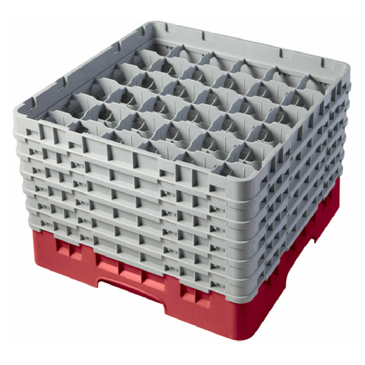 The Cambro 36S1114163 Camrack® Glass Rack with (6) soft gray extenders is a full-size solution designed for efficient glassware management in commercial settings. Measuring 19-3/4" x 19-3/4" x 13-3/4", this rack provides ample space for organized storage, featuring 36 compartments, each accommodating glassware with a maximum diameter of 2-7/8" and a maximum height of 11-3/4". Its vibrant red color not only adds visibility but also aligns with HACCP compliance, ensuring it meets high standards for food safety and sanitation. The inclusion of six soft gray extenders allows for customizable height adjustments, providing flexibility to accommodate different glass sizes and shapes. Certified by NSF, this glass rack guarantees adherence to public health and safety guidelines, making it a reliable choice for restaurants, bars, and catering services. Its robust design and thoughtful features make it particularly valuable for businesses looking to maintain organized, hygienic, and efficient operations in high-volume environments.
