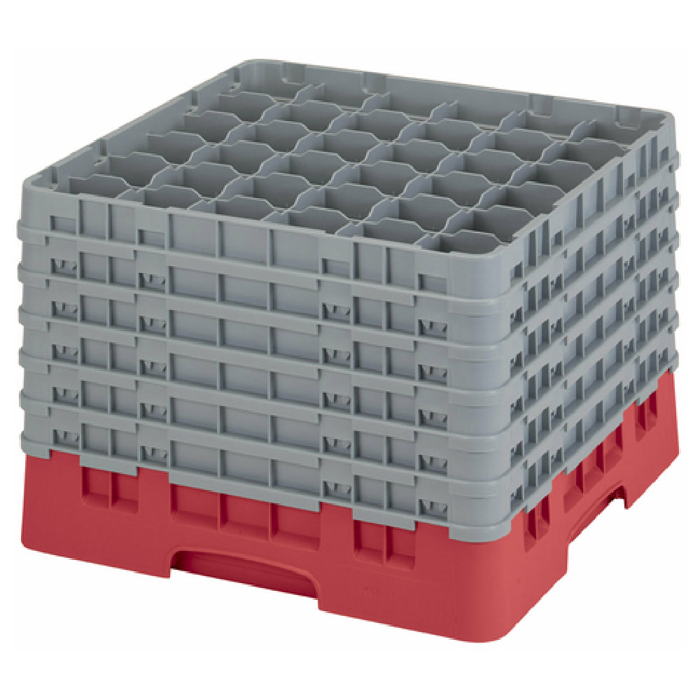 The Cambro 36S1214163 Camrack® Glass Rack With (6) Soft Gray Extenders Full Size is a comprehensive solution designed for efficient glassware handling in hospitality and food service industries. This full-size rack measures 19-3/4" x 19-3/4" x 13-3/4", providing a low profile that facilitates easy stacking and storage. It features (36) compartments, each accommodating a maximum diameter of 2-7/8" and a maximum height of 12-5/8", ensuring each glass is securely held and protected. The inclusion of (6) soft gray extenders enhances its adaptability, allowing for easy customization according to glassware size and shape variations. With a striking red color, the rack is easily identifiable, ensuring efficient organization. Being HACCP compliant and NSF certified, it meets stringent safety and sanitation standards, making it a reliable choice for businesses keen on maintaining high hygiene levels. Its robust construction and practical design make it particularly suited for high-volume environments such as restaurants, bars, and catering services that demand both efficiency and reliability in glassware management.