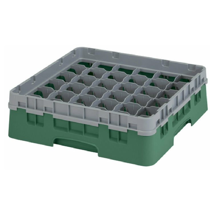 The Cambro 36S318119 Camrack® Glass Rack With Soft Gray Extender Full Size is a meticulously engineered storage solution designed to optimize glassware organization and safety within diverse industry sectors such as hospitality and food service. This full-sized rack measures 19-3/4 inches by 19-3/4 inches by 5-5/8 inches, making it suitable for accommodating a substantial number of glassware items. It features 36 compartments, each allowing a maximum diameter of 2-7/8 inches and a maximum height of 3-5/8 inches, ensuring a snug and secure fit for various glass types. The rack is enhanced with a soft gray extender, which adds to its structural integrity and versatility. In a distinctive Sherwood green color, this Camrack® is not only aesthetically pleasing but also easy to identify in busy service environments. The product is HACCP compliant, ensuring it meets stringent hygiene standards, and it also holds NSF certification, further attesting to its safety and quality. The Cambro 36S318119 is a vital asset for maintaining organized and hygienic glassware storage, catering to the operational needs of restaurants, catering services, and other establishments that prioritize efficiency and sanitation in their service delivery.