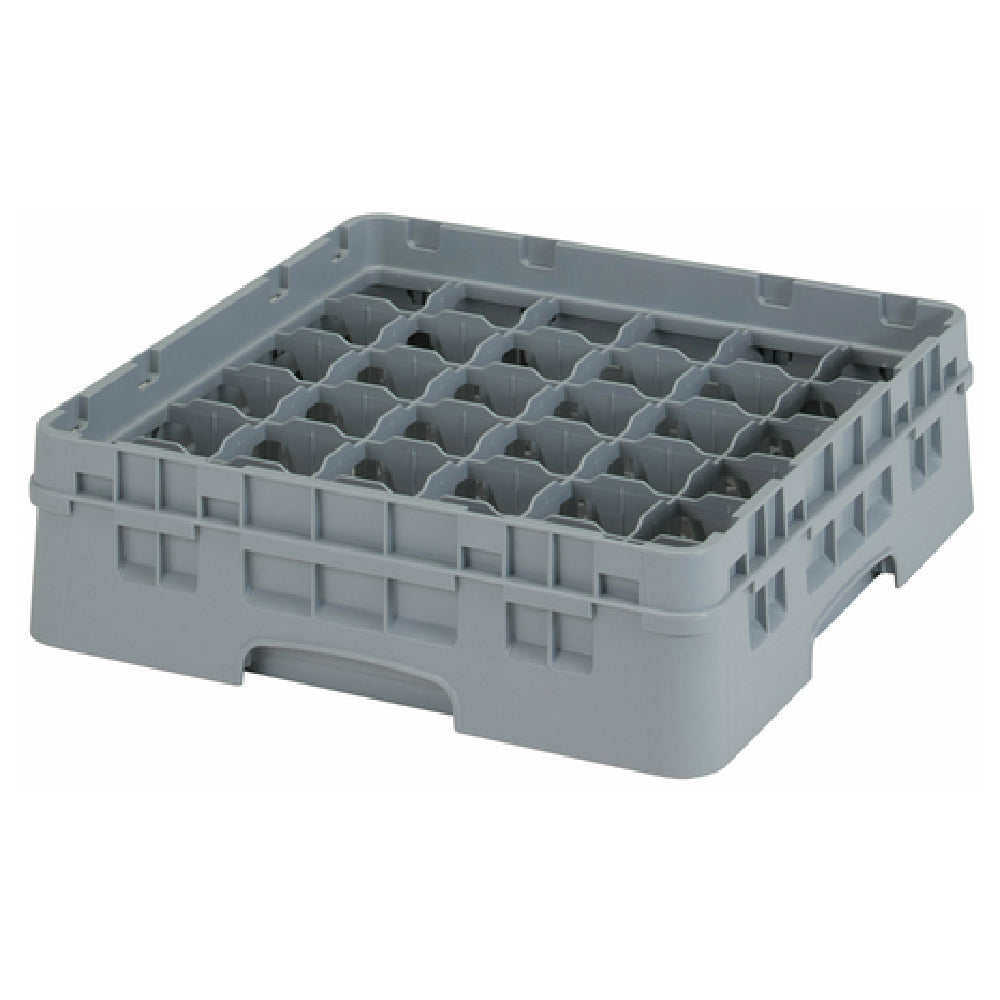 The Cambro 36S318151 Camrack® Glass Rack with Soft Gray Extender is a full-size storage solution measuring 19-3/4" x 19-3/4" x 5-5/8". This robust unit boasts 36 compartments, each accommodating glasses with a maximum diameter of 2-7/8" and a height of 3-5/8". Its soft gray extender is designed to enhance the rack's capacity and usability, making it a versatile tool in the hospitality and food service industries. The Camrack® is HACCP compliant, ensuring it meets the critical standards for food safety and hygiene. Additionally, its NSF certification highlights its adherence to rigorous public health and safety standards. Whether used in bustling restaurants, efficient catering services, or large-scale dining facilities, this glass rack supports efficient and organized storage while prolonging the life of glassware. Its structured design allows for easy integration into existing operations, maximizing space and streamlining processes. The Cambro 36S318151 Camrack® is a reliable choice for professionals seeking durability and functionality in their glass handling and storage solutions.