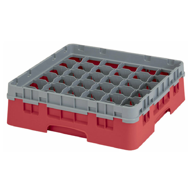 The Cambro 36S318163 Camrack® Glass Rack with Soft Gray Extender is a full-size, 19-3/4" x 19-3/4" x 5-5/8" storage solution designed to accommodate and protect delicate glassware. Featuring 36 individual compartments, each with a maximum diameter of 2-7/8" and a maximum height of 3-5/8", this glass rack is crafted to ensure optimal organization and safety during transportation and storage. The inclusion of a soft gray extender adds versatility, making it adaptable for various glass sizes and shapes, while the vibrant red color aids in quick identification and inventory management. Compliant with HACCP standards, this rack supports food safety and sanitation requirements, while its NSF certification further underscores its suitability for commercial kitchens and food service establishments. The Cambro 36S318163 Camrack® is an essential accessory for restaurants, bars, and caterers, providing a dependable and efficient means of handling glassware, thereby minimizing breakage and maximizing efficiency in high-volume settings.
