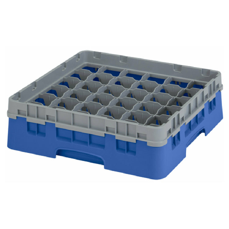 The Cambro 36S318168 Camrack® Glass Rack with Soft Gray Extender Full Size is a highly functional and versatile solution designed for efficient glassware management in commercial settings. Measuring 19-3/4" x 19-3/4" x 5-5/8", this glass rack features 36 individual compartments, each accommodating a maximum diameter of 2-7/8" and a maximum height of 3-5/8". The thoughtful design allows for secure storage and transportation of glassware, reducing the risk of breakage and ensuring hygiene. Its soft gray extender enhances its adaptability and stacking ability, which is particularly beneficial for establishments with varying storage needs. The rack's blue exterior not only provides a professional appearance but also signifies its compliance with HACCP standards, aiding in safe food handling practices. Additionally, this product is NSF certified, guaranteeing its adherence to strict safety and quality standards. The Cambro 36S318168 Camrack® is an essential tool for restaurants, bars, and catering services that require a reliable and efficient glassware organization system, delivering optimal protection and cleanliness for glassware inventory across diverse industry segments.