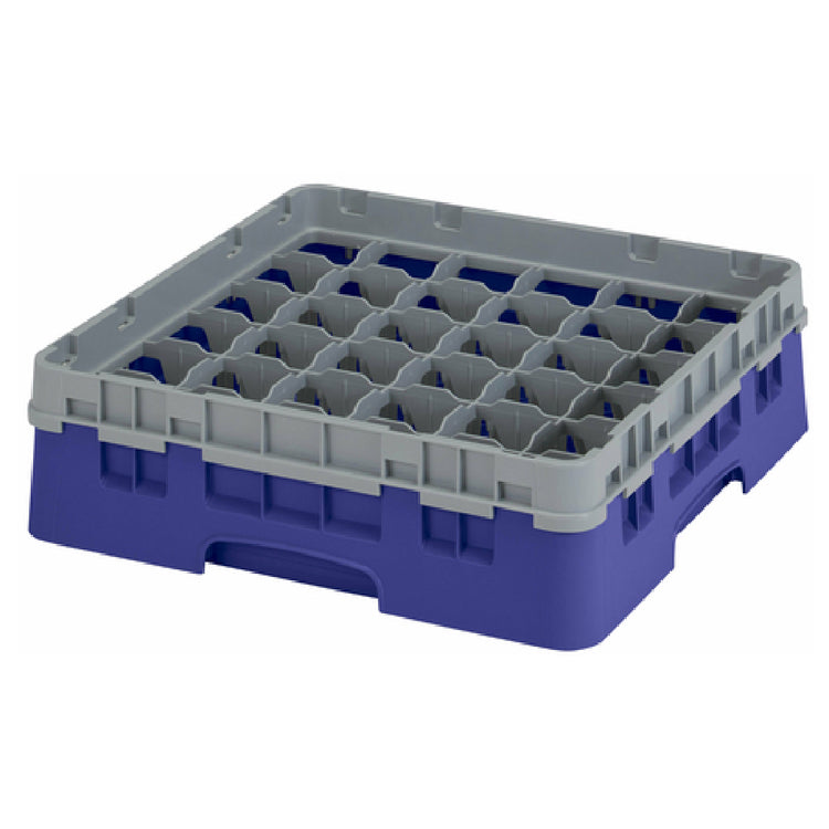 The Cambro 36S318186 Camrack® Glass Rack With Soft Gray Extender Full Size is meticulously engineered to cater to the diverse needs of the food and beverage industry, ensuring both practicality and reliability. Measuring 19-3/4 inches by 19-3/4 inches by 5-5/8 inches, this full-size glass rack is designed with 36 individual compartments, each accommodating a maximum diameter of 2-7/8 inches and a maximum height of 3-5/8 inches. Its sturdy construction is embodied in a navy blue finish, complemented by a soft gray extender that offers both aesthetic appeal and functional utility. The Cambro 36S318186 is HACCP compliant, making it a trusted choice for maintaining food safety standards across various service settings. Additionally, its NSF certification underscores its adherence to stringent public health and safety guidelines, further enhancing its credibility in professional environments. This glass rack's thoughtful design not only maximizes storage efficiency but also optimizes glassware protection during washing and transportation, making it an invaluable asset in fast-paced hospitality settings, from bustling restaurants to large-scale catering events.