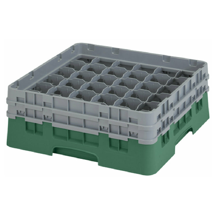 The Cambro 36S434119 Camrack® Glass Rack With (2) Soft Gray Extenders Full Size is a highly functional and versatile warewashing solution designed to meet the rigorous demands of the foodservice industry. This full-size glass rack measures 19-3/4" x 19-3/4" x 7-1/4", making it ideal for efficiently organizing and transporting glassware. The rack boasts 36 compartments, each accommodating a maximum diameter of 2-7/8" and a maximum height of 5-1/4", ensuring that a wide variety of glass sizes can be safely stored and washed. Enhanced with two soft gray extenders, the rack provides additional support and protects delicate glassware during handling. Constructed in an attractive Sherwood green finish, the Cambro 36S434119 is not only durable but also easy to identify. This glass rack is HACCP compliant, supporting food safety and hygiene standards, while its NSF certification guarantees adherence to public health standards. The low-profile design facilitates effortless stacking and storage, making this Camrack® an indispensable tool for restaurants, bars, and catering services aiming to streamline their operations with exceptional reliability and efficiency.