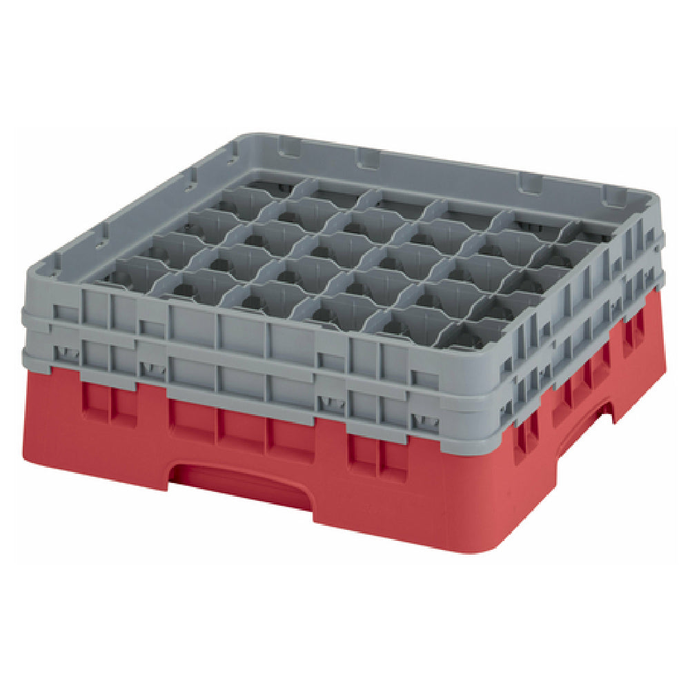 Cambro 36S434163 Camrack® Glass Rack with (2) Soft Gray Extenders Full Size features a design that caters to the specific needs of various segments within the food service and hospitality industries. This full-size glass rack measures 19-3/4 inches by 19-3/4 inches by 7-1/4 inches, making it an ideal solution for large-scale operations that require efficient and safe glass storage and transport. The inclusion of two soft gray extenders enhances its capacity, accommodating a total of 36 compartments, each with a maximum diameter of 2-7/8 inches and a maximum height of 5-1/4 inches. This low-profile design is perfect for optimizing space without compromising the integrity of the glassware. The rack's eye-catching red exterior not only adds a touch of color but also aids in easy identification and organization. The Cambro 36S434163 is HACCP compliant and NSF certified, ensuring it meets the stringent standards for health and safety in professional environments. This glass rack represents a blend of functionality and compliance, making it a valuable asset for establishments looking to maintain high standards of hygiene and efficiency in their operations.