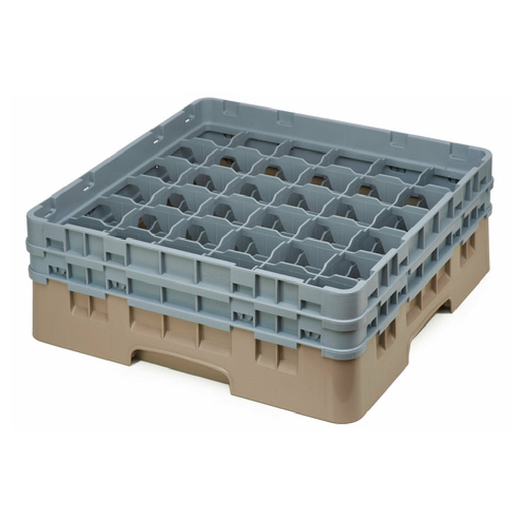 The Cambro 36S434184 Camrack® Glass Rack With (2) Soft Gray Extenders Full Size is an essential tool for optimizing glassware storage and transportation in various food service settings. This full-size rack, measuring 19-3/4" x 19-3/4" x 7-1/4", features a low-profile design which allows for efficient stacking and storage. It includes (36) compartments, each accommodating a maximum diameter of 2-7/8" and a maximum height of 5-1/4", making it suitable for a variety of glass sizes commonly used in restaurants, hotels, and catering services. The addition of (2) soft gray extenders enhances the rack's capacity and protection, ensuring the secure placement of taller glasses. The rack is HACCP compliant, highlighting its commitment to meeting stringent hygiene standards. Furthermore, it holds an NSF certification, assuring compliance with global public health and safety regulations. The Camrack® Glass Rack is constructed with a durable beige material, providing long-lasting performance and ease of cleaning. This product is designed to meet the specific needs of different market segments within the food service industry, offering a reliable and efficient solution for glassware management.