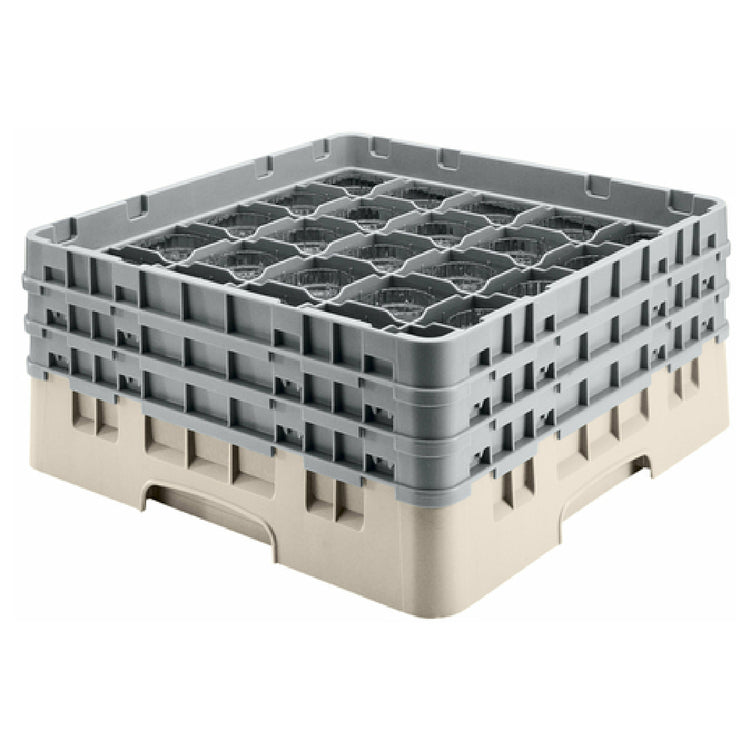 The Cambro 36S534184 Camrack® Glass Rack With (2) Soft Gray Extenders Full Size is an efficient and versatile solution for glassware storage and transportation in various food service operations. Featuring (36) compartments, each accommodating a maximum diameter of 2-7/8" and a maximum height of 6-1/8", this glass rack ensures that glassware remains secure and organized. The rack measures 19-3/4" x 19-3/4" x 7-1/4", providing a compact yet full-size design that is ideal for optimizing space. The inclusion of two soft gray extenders enhances the rack's functionality, allowing for adjustable compartment heights to accommodate different glass sizes. The low-profile design not only facilitates easy handling but also aids in seamless integration into existing workflows. Constructed in a beige hue, this glass rack is HACCP compliant, ensuring it meets critical food safety standards, and it is NSF certified, highlighting its adherence to international health and safety guidelines. The Cambro Camrack® is a reliable choice for hospitality professionals seeking a durable and practical glassware management solution that caters to diverse market segments, from bustling restaurants to efficient catering services. This product's meticulous design and compliance with industry standards make it a valuable asset in maintaining organized and sanitary glassware storage.