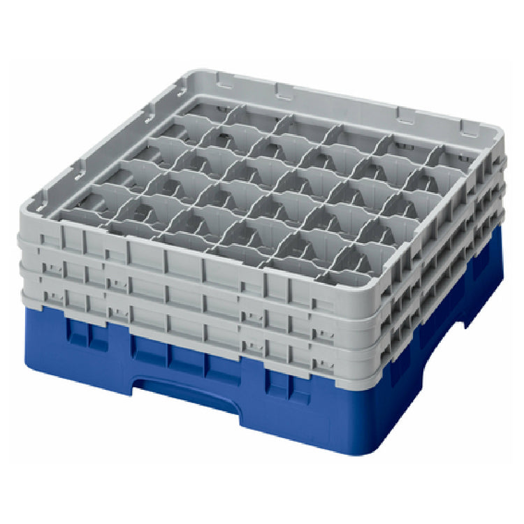 The Cambro 36S638168 Camrack® Glass Rack with (3) Soft Gray Extenders Full Size is a meticulously designed solution tailored for the hospitality and food service industry, providing exceptional organization and protection for glassware. Measuring 19-3/4" x 19-3/4" x 8-7/8", this full-size rack accommodates 36 compartments, each with a 2-7/8" maximum diameter and a 6-7/8" maximum height. This ensures the safe storage and transport of a wide range of glassware sizes, perfect for catering services, restaurants, and event venues. The inclusion of three soft gray extenders enhances its adaptability, allowing it to securely hold taller glassware items. Its blue structure not only adds a visual appeal but also signifies HACCP compliance, making it a reliable choice for maintaining hygiene standards. Furthermore, the rack is NSF certified, underscoring its adherence to public health and safety guidelines. The Cambro Camrack® is your go-to solution for efficiently managing glassware, minimizing the risk of breakage during handling, and promoting operational efficiency within any commercial kitchen environment. Its durability and thoughtful design elements make it an indispensable asset across various market segments, from small cafes to large banquet facilities, aiming for optimum glassware care and organization.