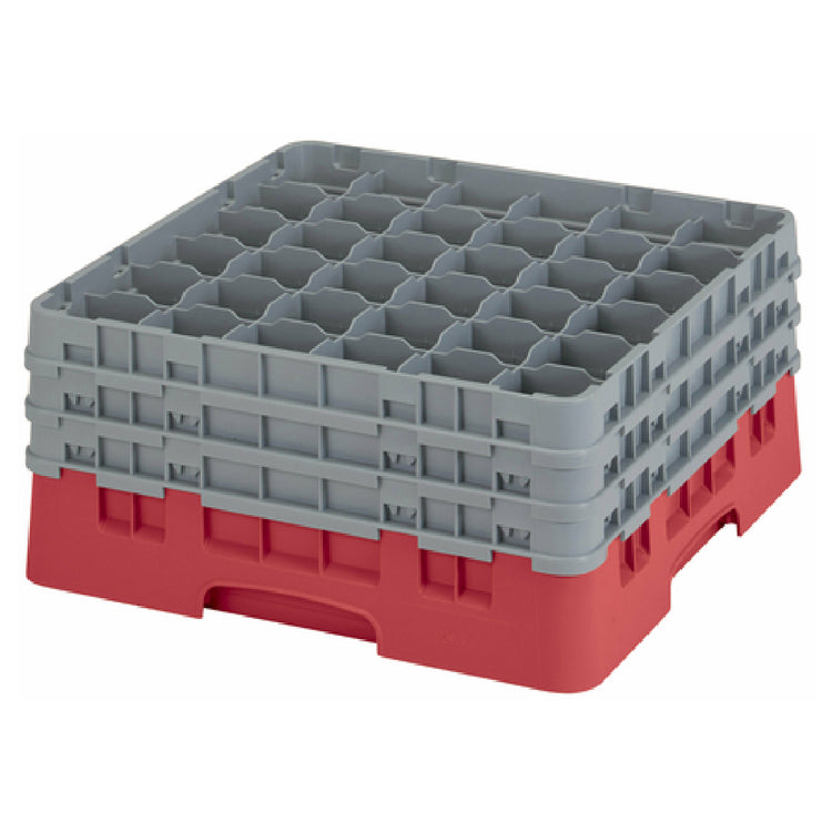 The Cambro 36S738163 Camrack® Glass Rack is a full-size, low-profile solution designed with efficiency and practicality in mind for the food service industry. Measuring 19-3/4" x 19-3/4" x 8-7/8", it features 36 compartments, each accommodating a maximum diameter of 2-7/8" and a maximum height of 7-3/4". This makes the glass rack an ideal choice for commercial kitchens looking to maximize storage while maintaining a neat and organized workspace. The unit includes three soft gray extenders, providing flexibility and adaptability for various glass sizes. Its red color makes it easily identifiable in busy environments. The Cambro 36S738163 is HACCP compliant, ensuring it meets stringent food safety standards, and is NSF certified, confirming its quality and reliability in professional settings. This glass rack is designed to integrate seamlessly into washing and storage processes, making it a versatile and essential tool for restaurants, bars, and catering services. Its robust construction and precise dimensions ensure that it caters to the demanding needs of high-volume operations, promising durability and efficiency in every use.