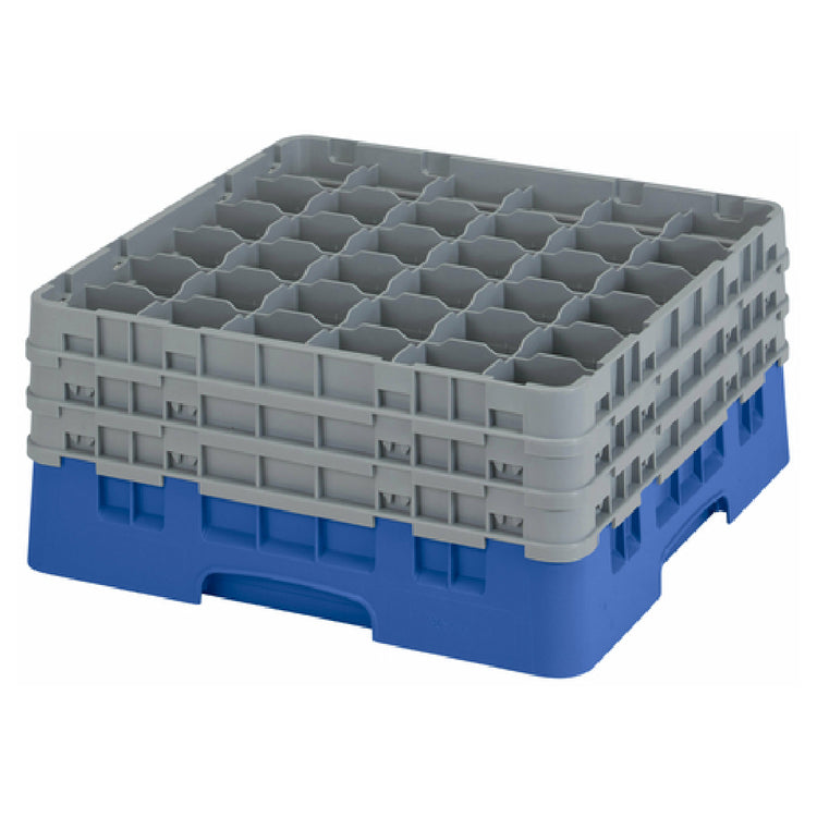 The Cambro 36S738168 Camrack® Glass Rack with (3) soft gray extenders is a full-size, low-profile solution designed to transform glassware management across various industries. Measuring 19-3/4" x 19-3/4" x 8-7/8", this efficient glass rack offers a practical design that accommodates up to 36 compartments, each supporting a maximum diameter of 2-7/8" and a maximum height of 7-3/4". The inclusion of three soft gray extenders enhances its capacity and versatility, making it particularly valuable for businesses with high turnover in glassware usage. The rack's blue construction not only adds a visual appeal but also signifies its HACCP compliance, ensuring it meets rigorous safety standards. Additionally, it is NSF certified, confirming its adherence to public health protection requirements. This Camrack® Glass Rack is ideal for restaurants, hotels, and catering services that demand reliable and hygienic glassware storage and transportation solutions. Its robust design and technical specifications make it a standout product in the market, offering an effective combination of safety, efficiency, and ease of use tailored for various professional environments.