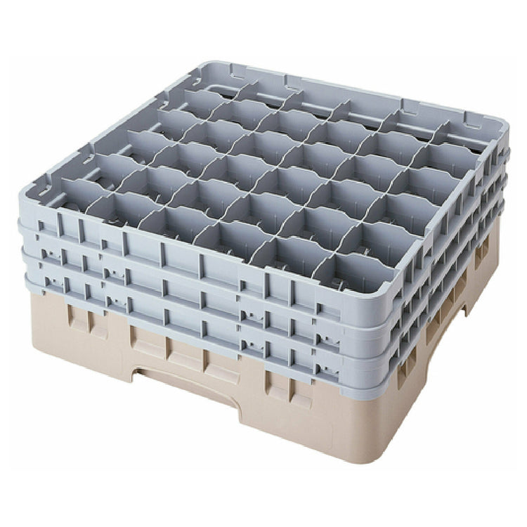 The Cambro 36S738184 Camrack® Glass Rack with (3) soft gray extenders is a full-size, low-profile solution meticulously designed for efficient glassware management in diverse settings such as restaurants, hotels, and catering services. With dimensions of 19-3/4" x 19-3/4" x 8-7/8", this rack offers a compact yet ample configuration, featuring 36 compartments, each accommodating glassware with a maximum diameter of 2-7/8" and a height of up to 7-3/4". The inclusion of three soft gray extenders enhances its adaptability, ensuring secure storage and protection of delicate items. Its beige finish complements various storage environments while maintaining a clean aesthetic. This Camrack® is HACCP compliant, ensuring adherence to food safety protocols, and holds NSF certification, reflecting its compliance with public health standards. Ideal for optimizing operational efficiency, this durable and thoughtfully designed glass rack provides a streamlined approach to handling and transporting glassware in commercial settings, emphasizing safety and cleanliness.