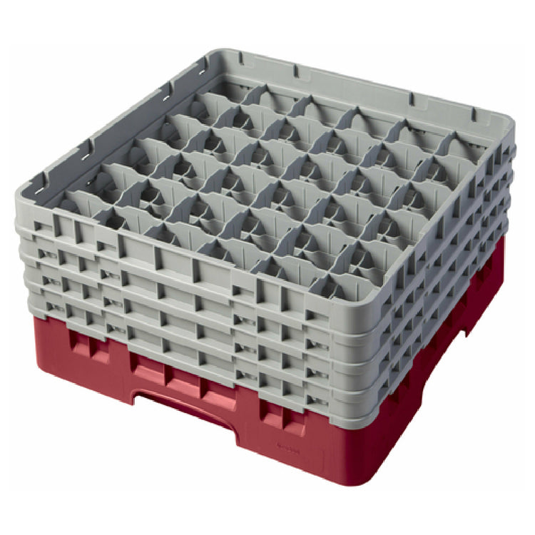 The Cambro 36S800416 Camrack® Glass Rack With (4) Soft Gray Extenders Full Size is a specialized storage solution designed to meet the demands of the food service industry. Measuring 19-3/4" x 19-3/4" x 10-1/2", this full-size rack is equipped with 36 compartments, each accommodating a maximum diameter of 2-7/8" and a height of up to 8-1/2". This makes it an ideal choice for safely storing and transporting various glassware sizes in restaurants, catering services, and hospitality venues. The inclusion of four soft gray extenders enhances the rack's flexibility, allowing it to adapt to different glass sizes while ensuring optimal protection from breakage. Its cranberry color adds a touch of visual appeal, making it easy to identify among other storage solutions. The Camrack® Glass Rack is constructed in compliance with HACCP standards, ensuring it meets necessary food safety regulations, and is NSF certified, highlighting its adherence to strict sanitation requirements. This product is a valuable investment for businesses seeking a reliable and efficient way to handle glassware logistics while maintaining hygiene and safety standards.