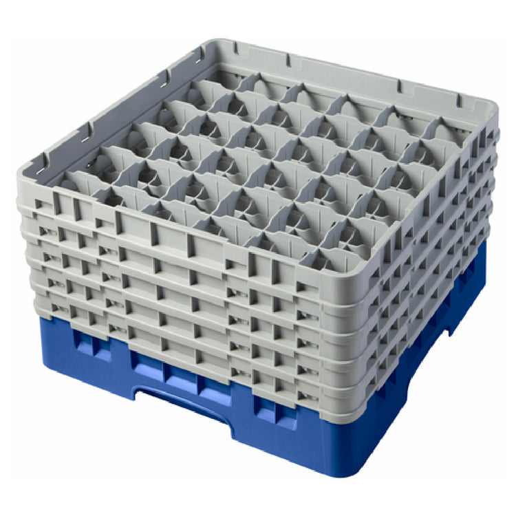 The Cambro 36S958168 Camrack® Glass Rack With (5) Soft Gray Extenders Full Size is an essential asset for businesses that require efficient and organized glassware storage. This full-size rack, measuring 19-3/4" x 19-3/4" x 12-1/8", features 36 compartments, each accommodating glasses with a maximum diameter of 2-7/8" and a maximum height of 10-1/8". Designed in an appealing blue hue, this rack includes five soft gray extenders, enhancing its capacity and adaptability to various glass sizes. The Cambro 36S958168 is HACCP compliant, ensuring that it meets the necessary safety standards vital for food service and hospitality industries. Furthermore, it is NSF certified, underscoring its adherence to stringent public health guidelines. This glass rack is particularly beneficial for restaurants, hotels, and catering services seeking to maximize space efficiency while maintaining high standards of hygiene and organization. With its thoughtful design and robust construction, the Cambro 36S958168 Camrack® provides a reliable and practical solution for glassware storage, making it a valuable investment for businesses aiming to streamline their operations.