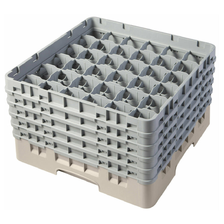 The Cambro 36S958184 Camrack® Glass Rack with (5) Soft Gray Extenders Full Size is a meticulously designed solution for organizing and transporting glassware in commercial settings. This full-size glass rack features a substantial footprint of 19-3/4" x 19-3/4" x 12-1/8", providing ample space for a total of 36 compartments. Each compartment accommodates a maximum diameter of 2-7/8" and a maximum height of 10-1/8", making it suitable for a variety of glass sizes and shapes. The inclusion of five soft gray extenders enhances its storage capacity while maintaining a secure fit for all glassware. The rack is finished in a neutral beige color that complements any professional kitchen or bar environment. Complying with HACCP standards, the Cambro Glass Rack ensures sanitary conditions are met, and with its NSF certification, it stands as a reliable choice for establishments prioritizing health and safety compliance. Designed for durability and functionality, this glass rack addresses the needs of restaurants, hotels, and catering businesses by providing an efficient and organized method to handle glassware, reducing breakage risks and streamlining operational workflow. Its thoughtful construction and adherence to industry standards make it a quintessential choice for professionals in the foodservice industry.